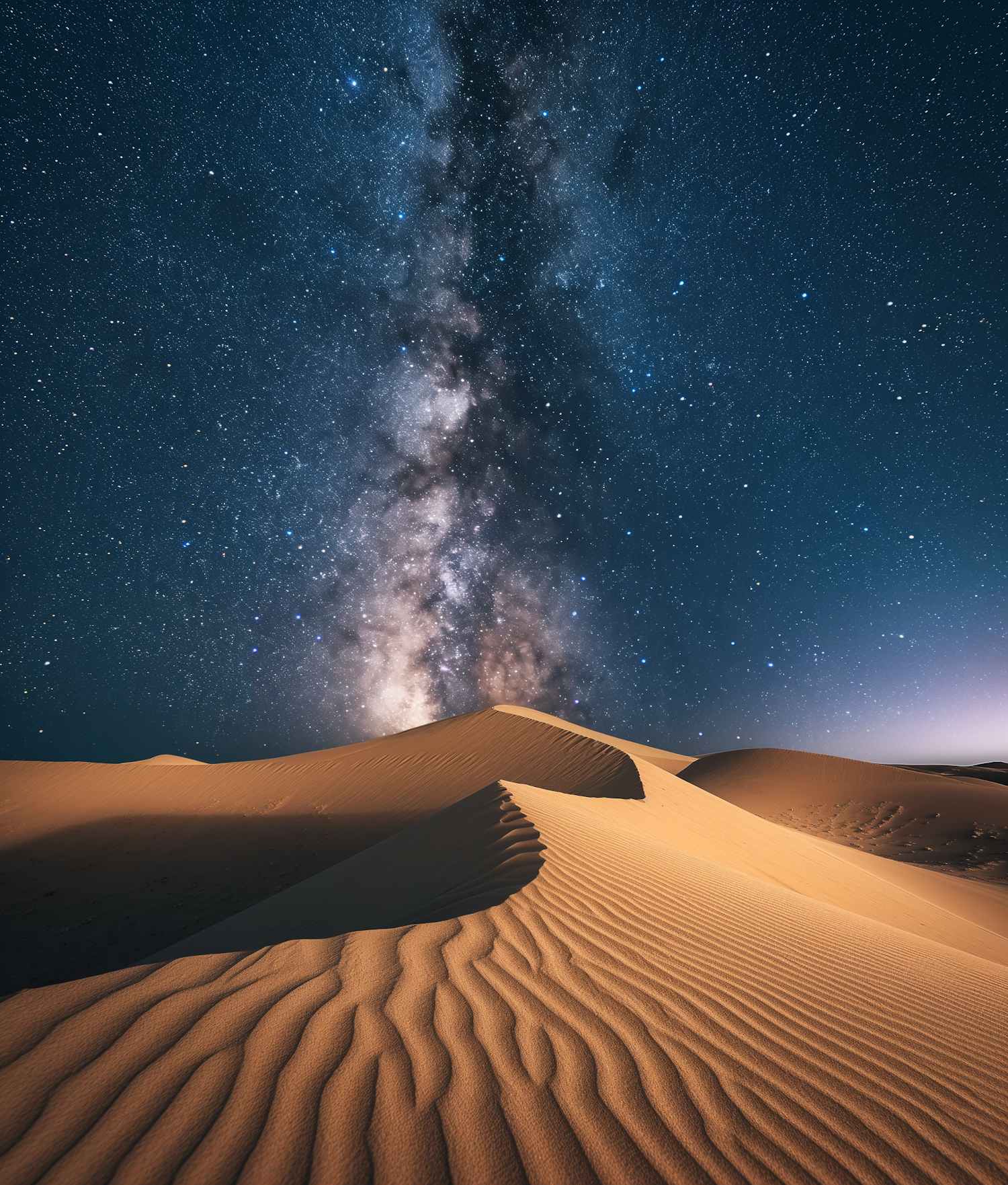 Golden sand dunes under the Milky Way's vivid stars, blending warm desert tones with a cosmic night sky.