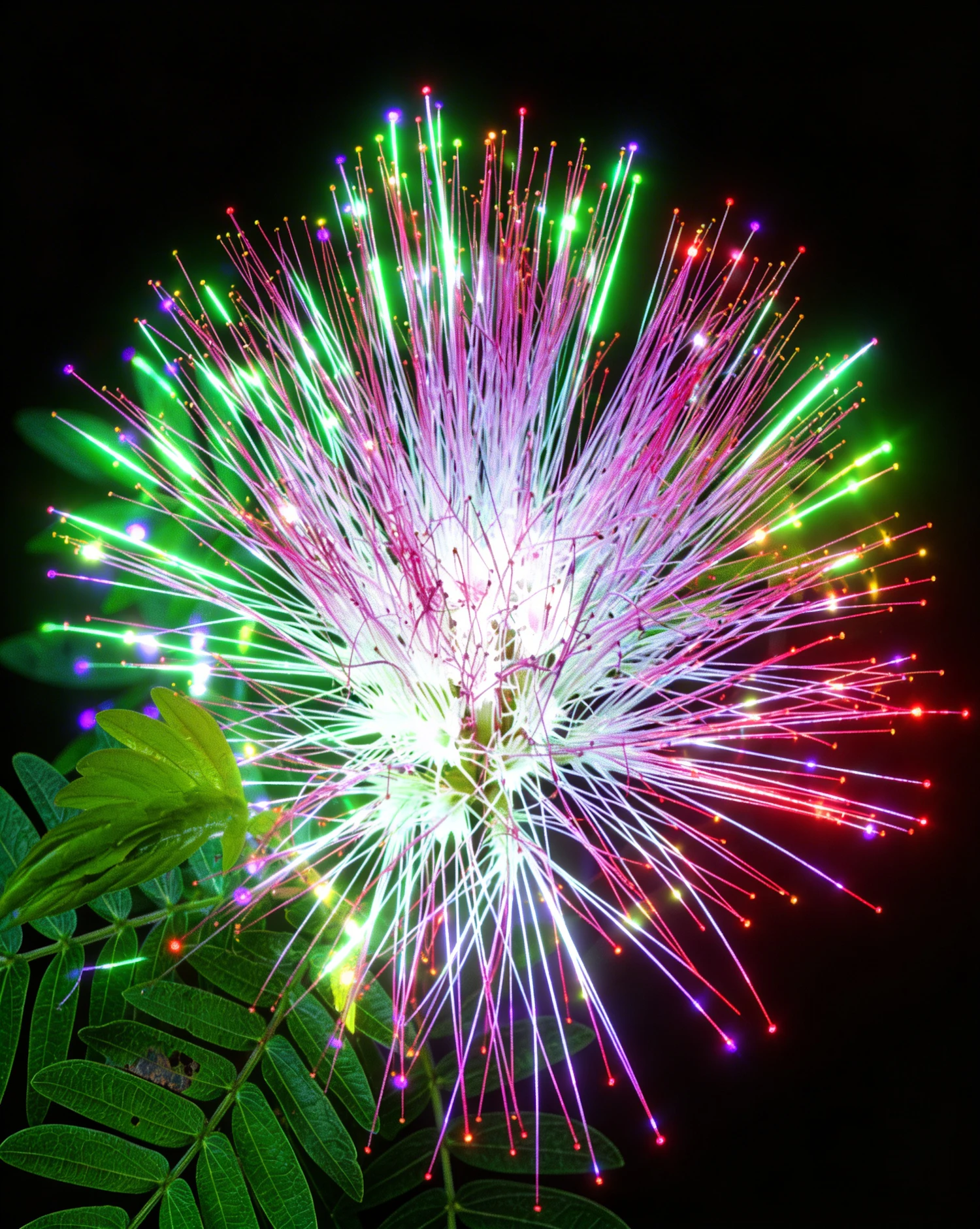 A close-up of a mimosa flower with vibrant pink, green, and yellow filaments, resembling fireworks against a dark background.