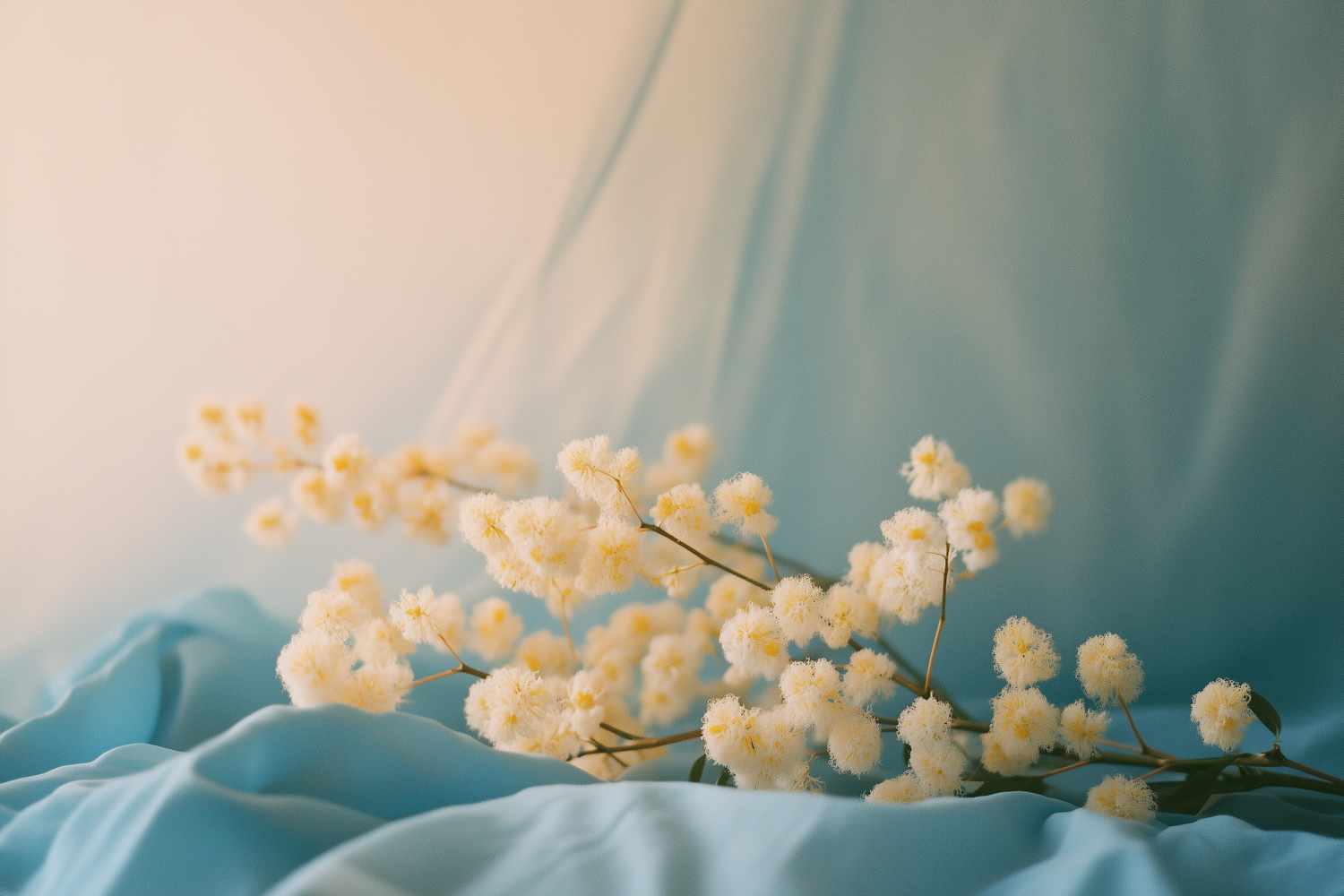 Soft white mimosa flowers on a light blue fabric backdrop, creating a serene and minimalistic aesthetic with warm, diffused lighting.