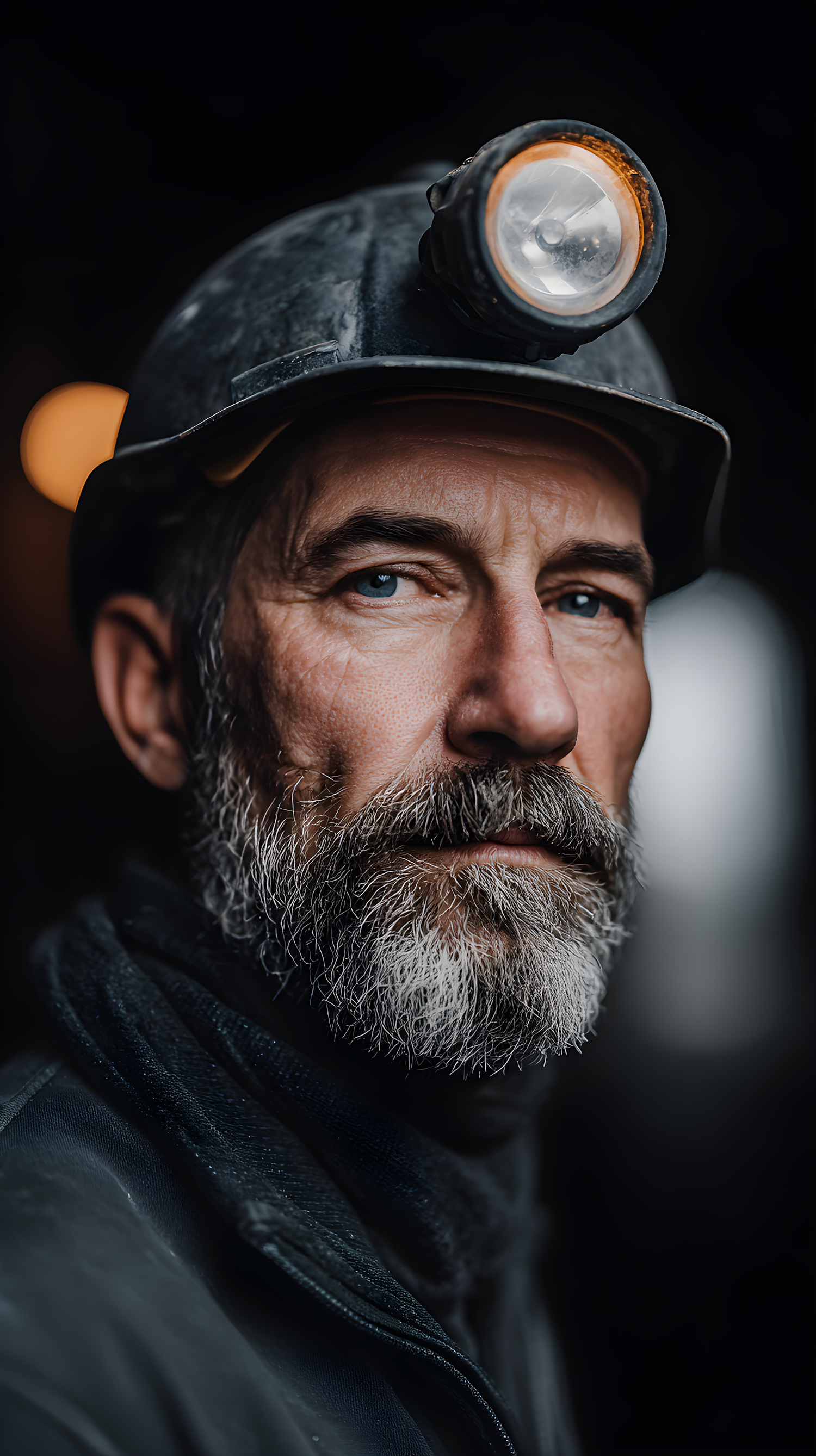 Portrait of a miner with a helmet and headlamp, showcasing a rugged face and piercing blue eyes in a dimly lit setting.
