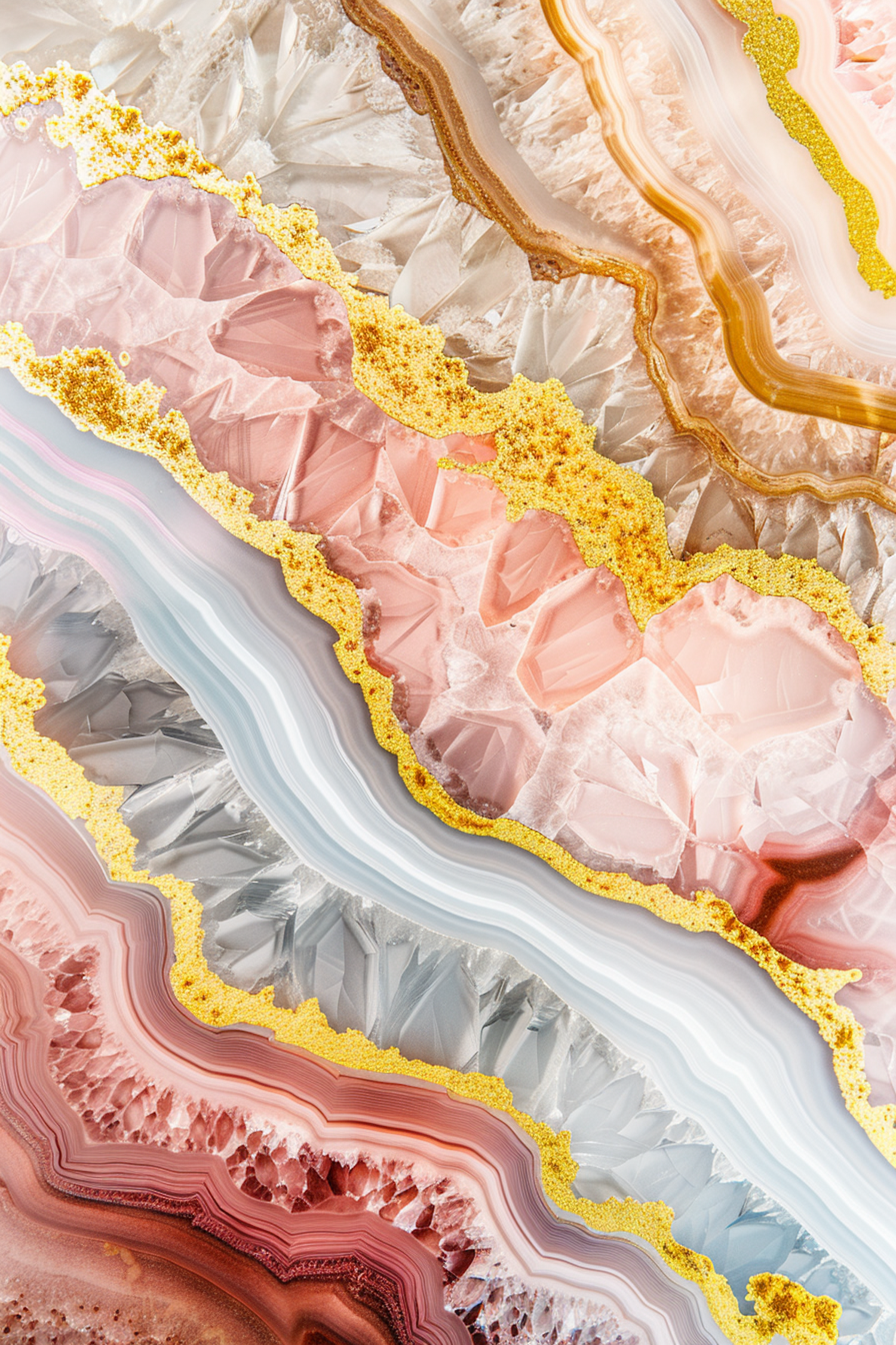 Abstract agate stone layers with pink, white, and gold accents, showcasing intricate patterns and rich textures.