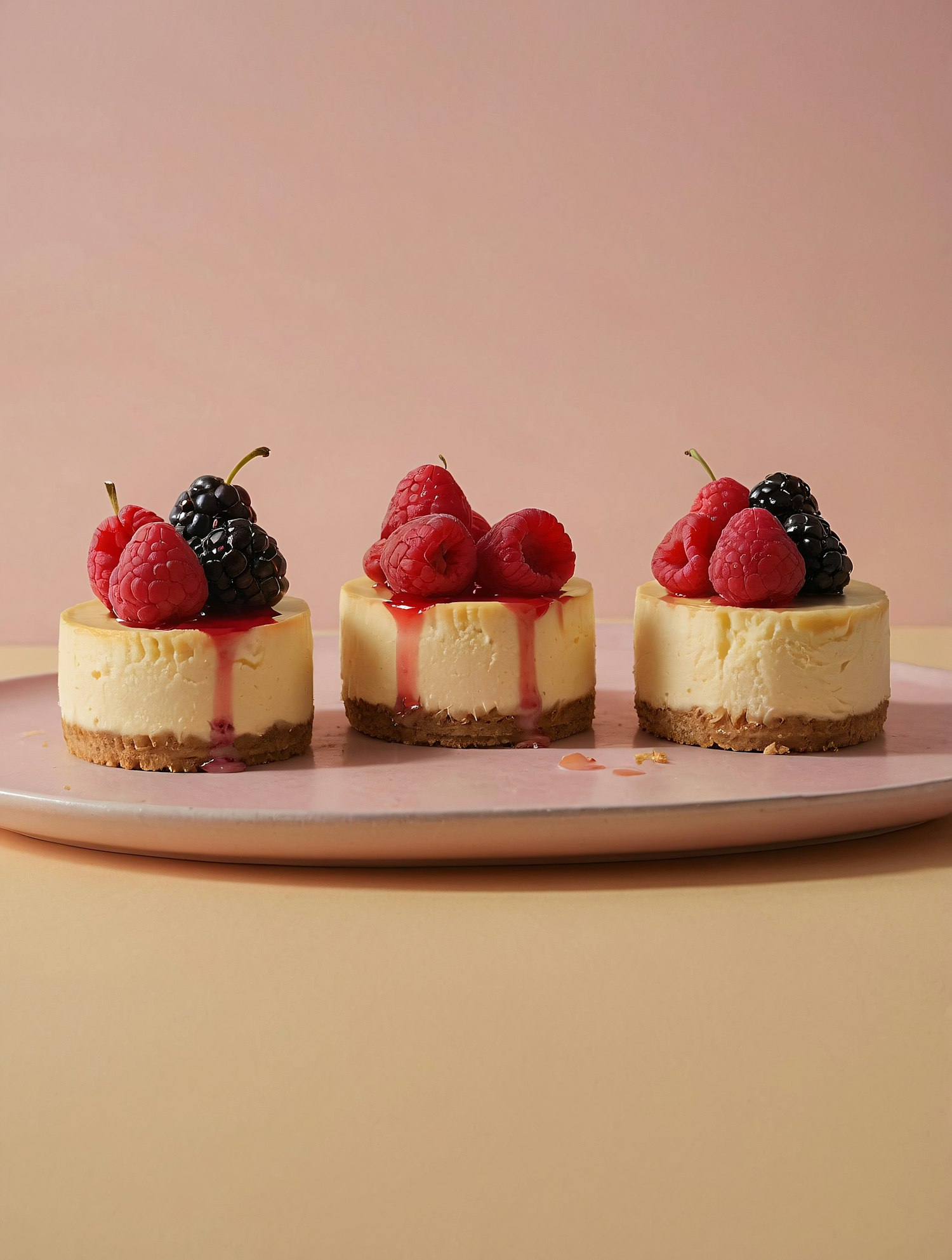 Three mini cheesecakes topped with fresh raspberries, blackberries, and berry sauce on a pink plate with a soft pastel background.
