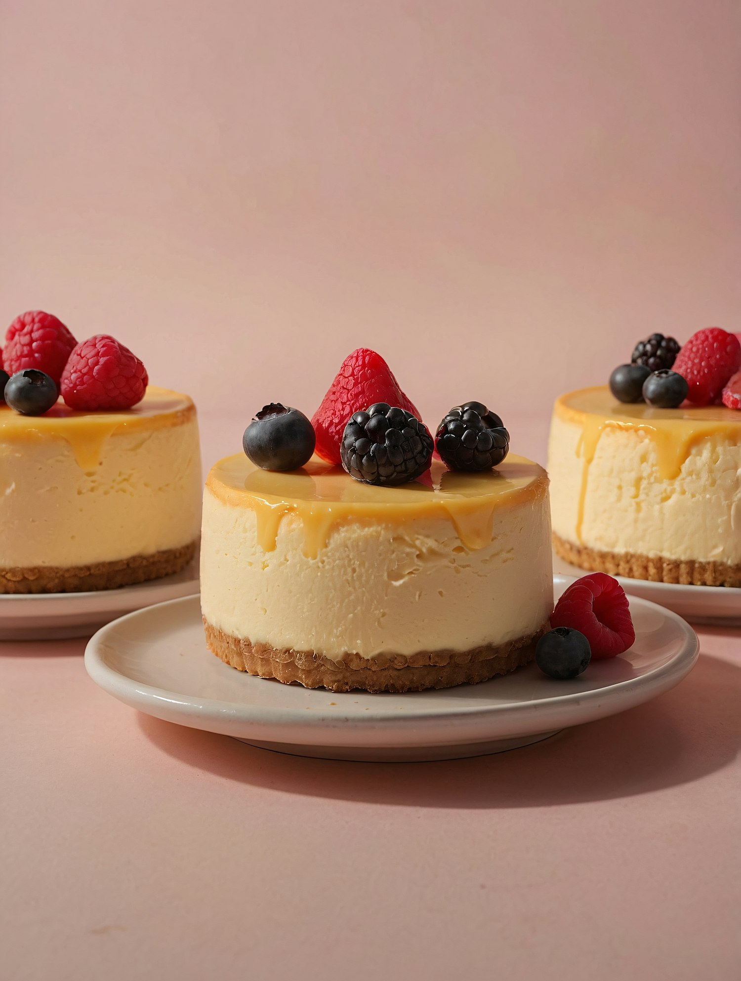 Mini cheesecakes with caramel drizzle and fresh berries on white plates, set against a soft pink background. Perfect for dessert lovers!