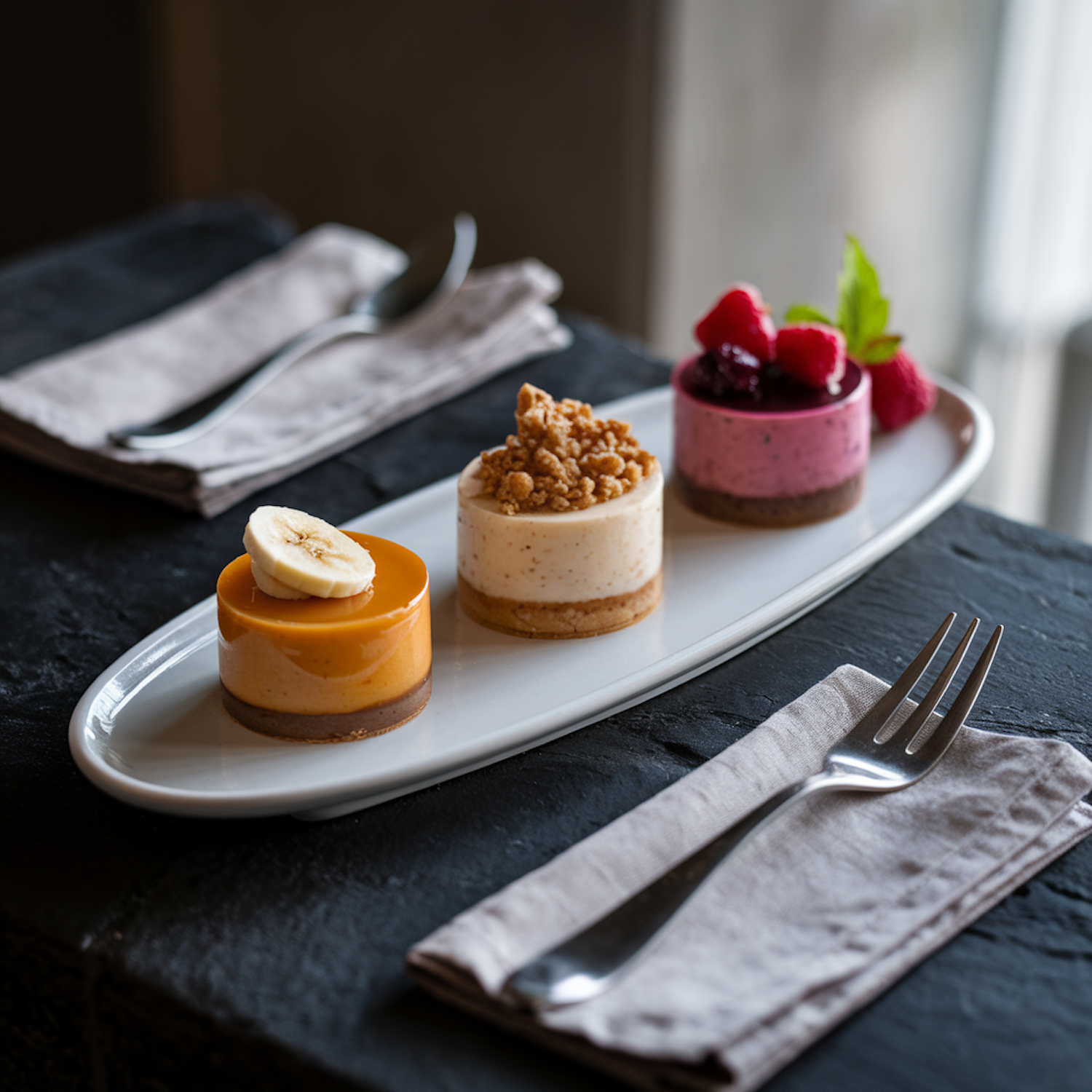 A trio of mini cheesecakes with unique toppings on a white plate, set on a dark table with napkins and cutlery.