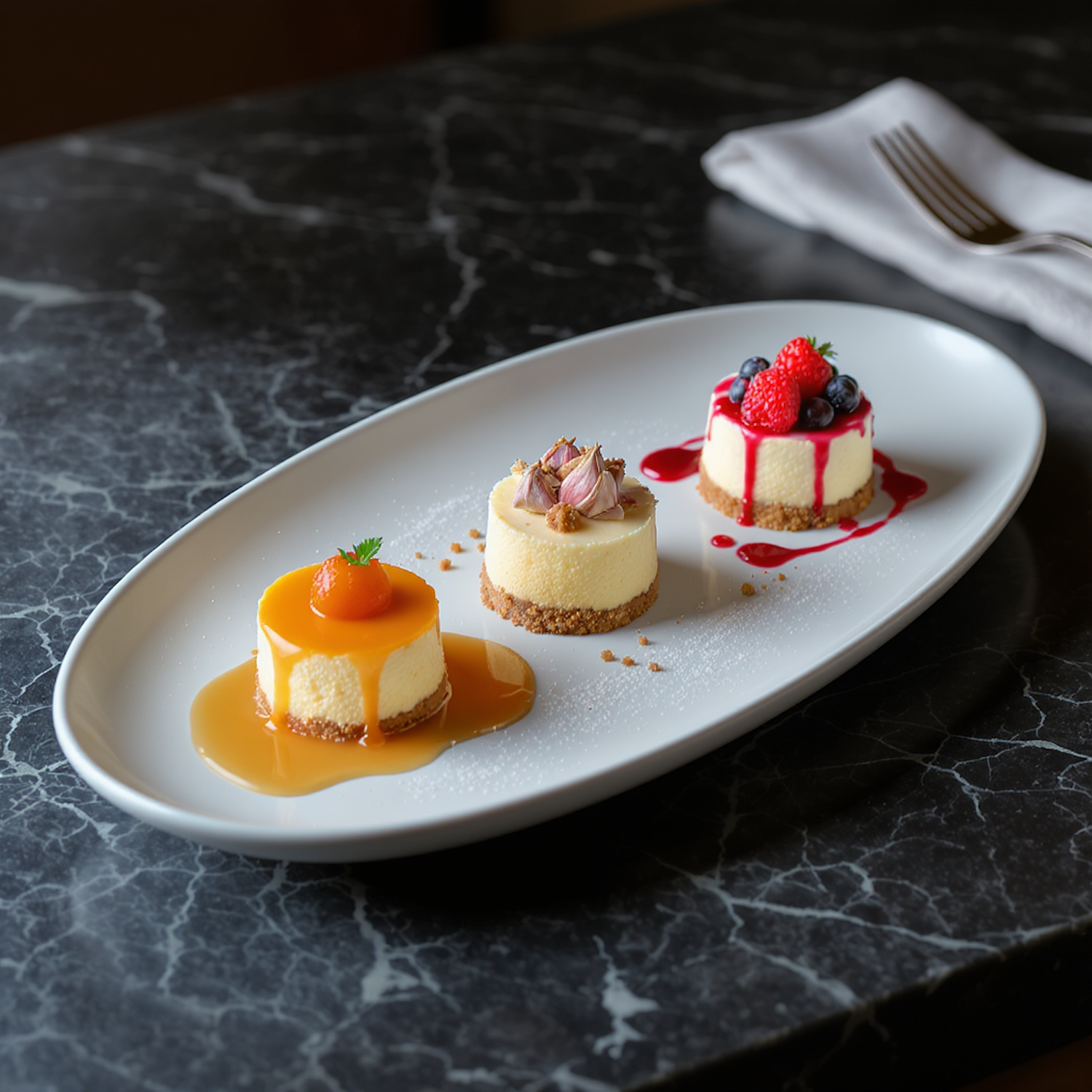 A trio of mini cheesecakes with unique toppings on a white plate, set on a dark marble table for a sophisticated dessert presentation.