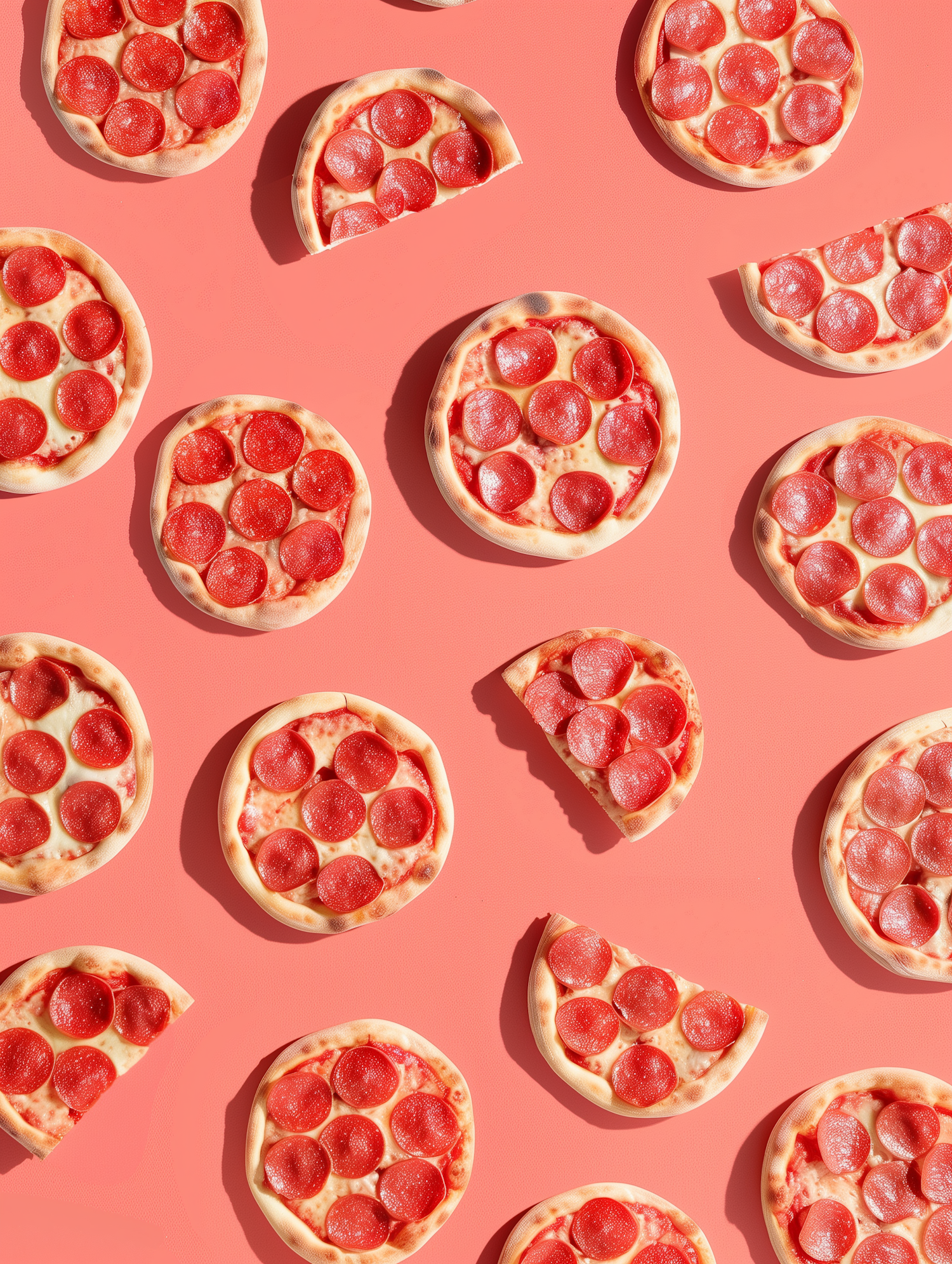Mini pepperoni pizzas on a pink background, arranged in a fun pattern with whole and sliced pieces. Perfect for food lovers!