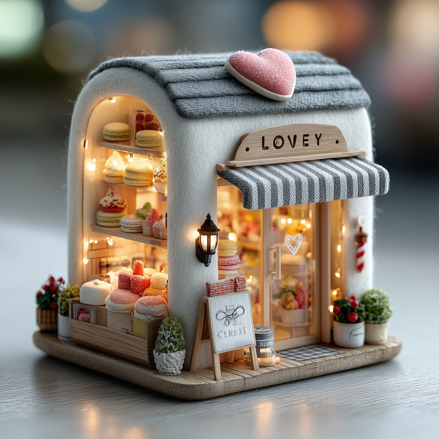 A detailed miniature bakery model with pastries, warm lighting, and charming decor, perfect for collectors or enthusiasts.