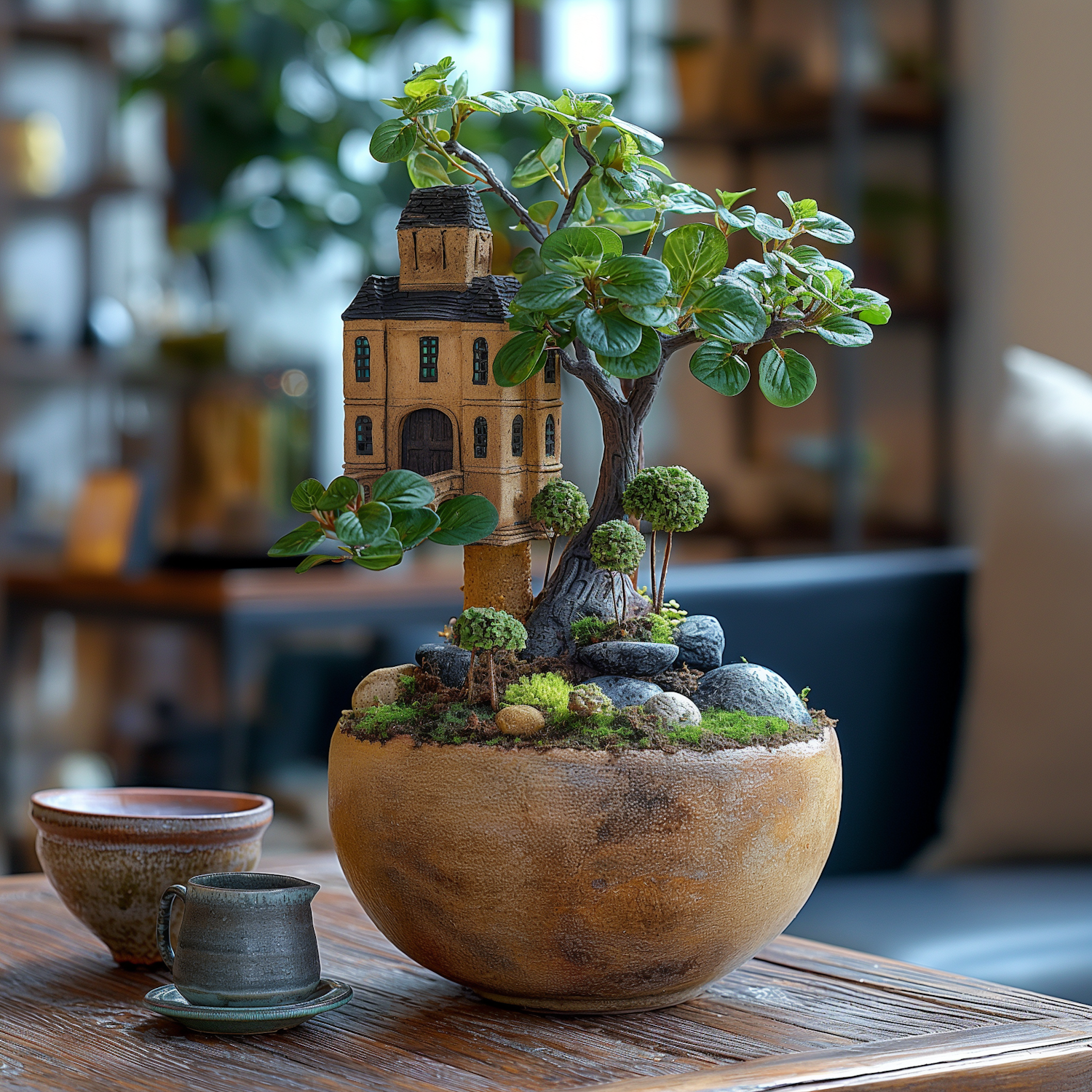 Miniature house and bonsai tree in a rustic pot on a wooden table, creating a charming indoor scene with natural and architectural elements.
