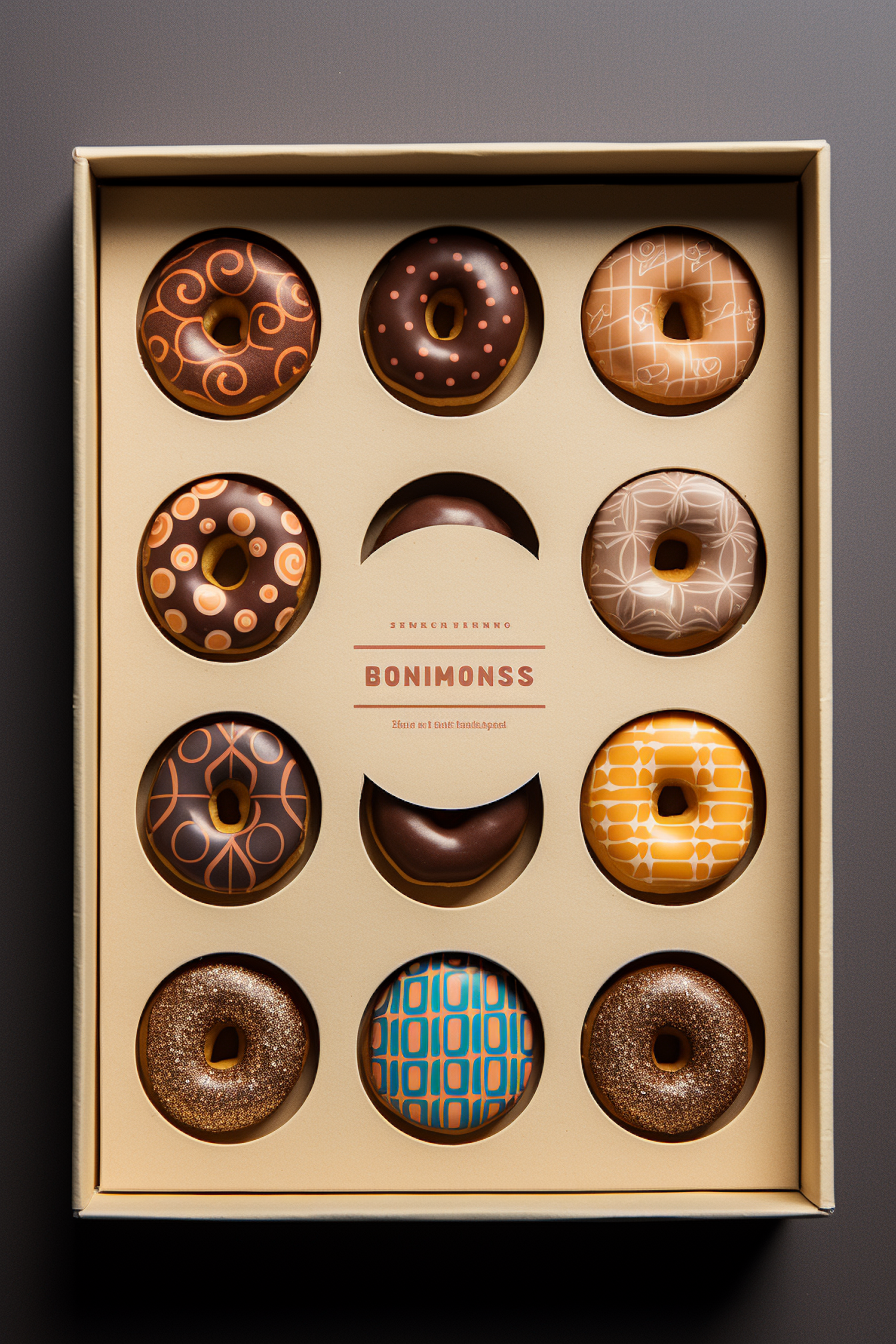 Elegant box of twelve uniquely decorated donuts with intricate patterns and vibrant colors, labeled 'BONIMONSS'.