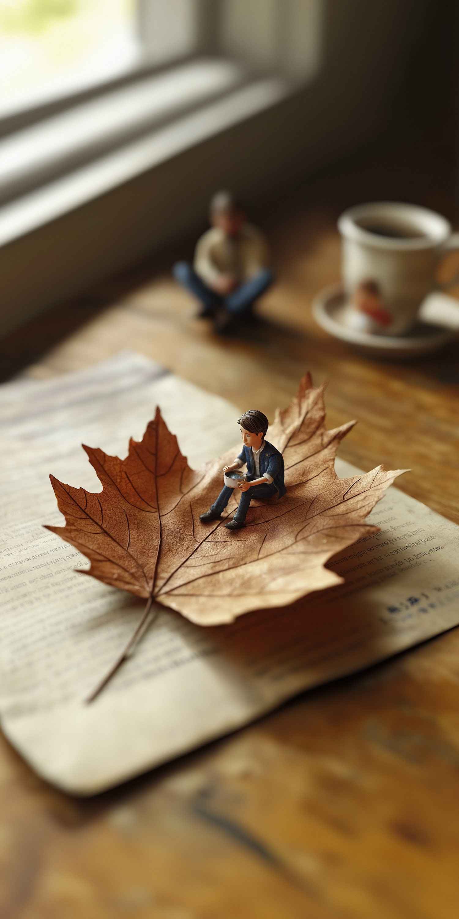 Miniature figure on a maple leaf with a cup, set on a book. Cozy, whimsical scene with warm tones and soft lighting.