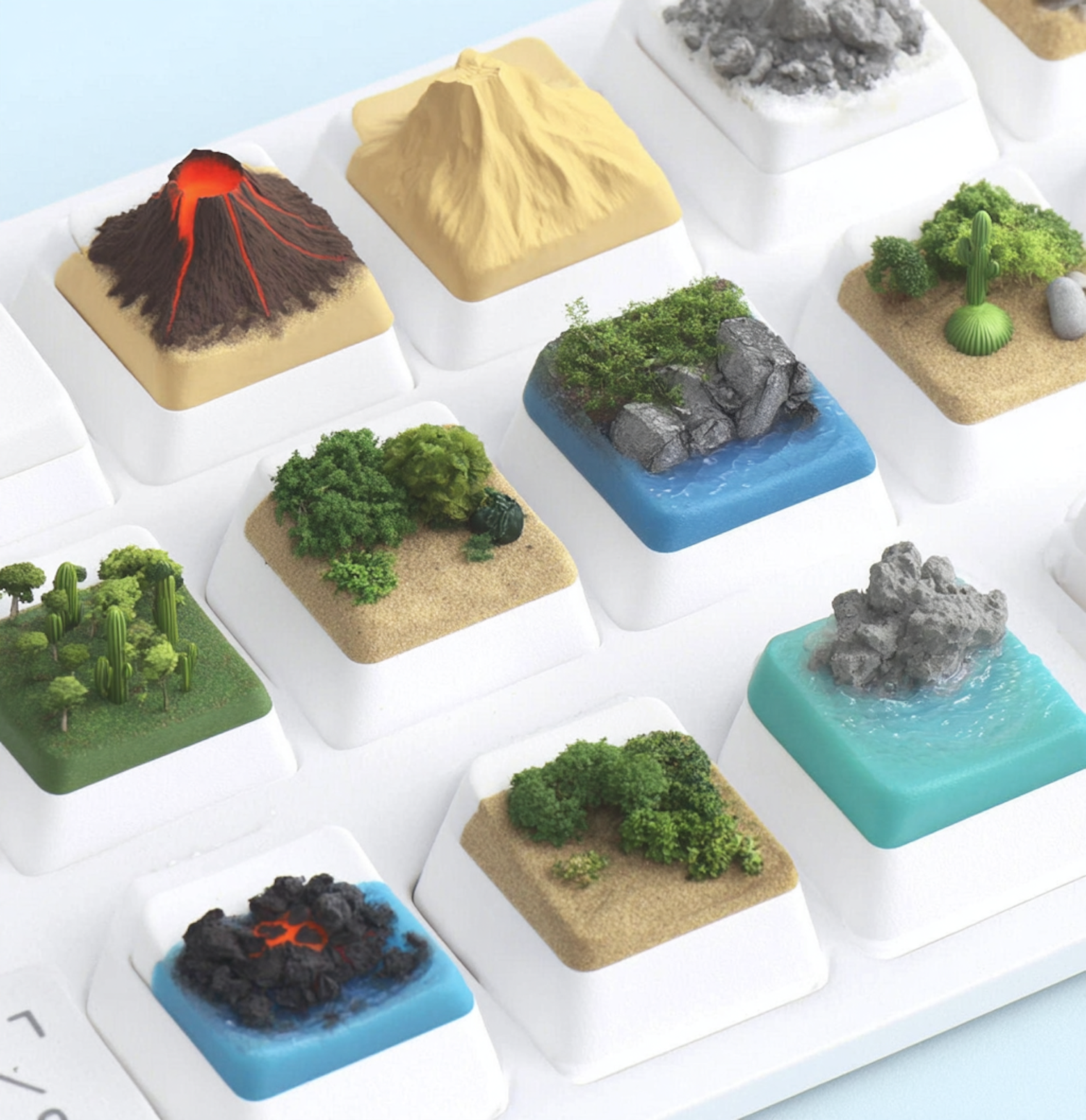 Miniature diorama keycaps showcasing diverse natural landscapes like volcanoes, forests, and coastlines, arranged in a keyboard layout.