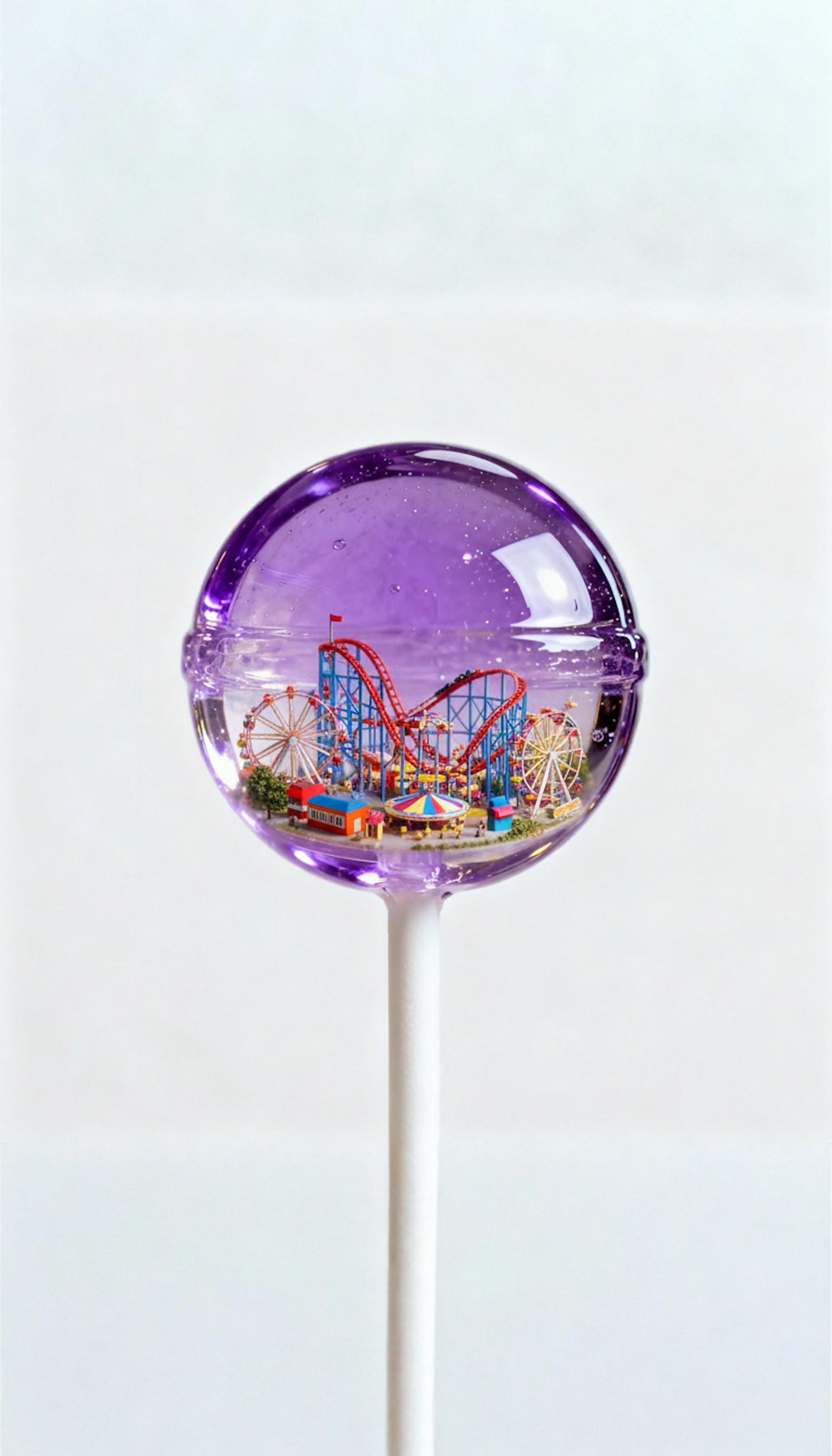 A purple lollipop encases a detailed miniature amusement park with a roller coaster and Ferris wheel, creating a whimsical scene.