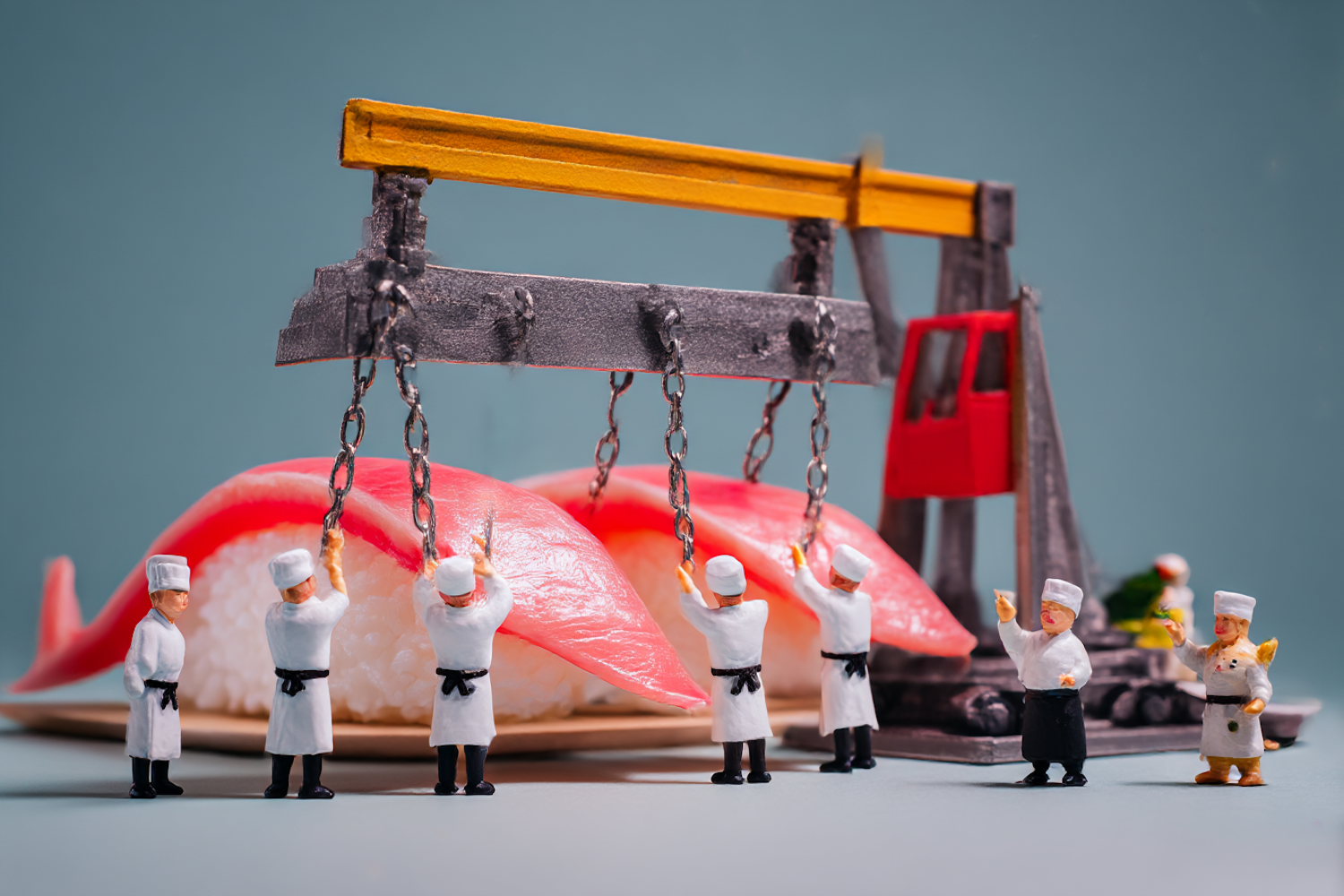 Miniature chefs construct oversized sushi with a crane in a playful, surreal scene. Vibrant colors and creative details make it captivating.