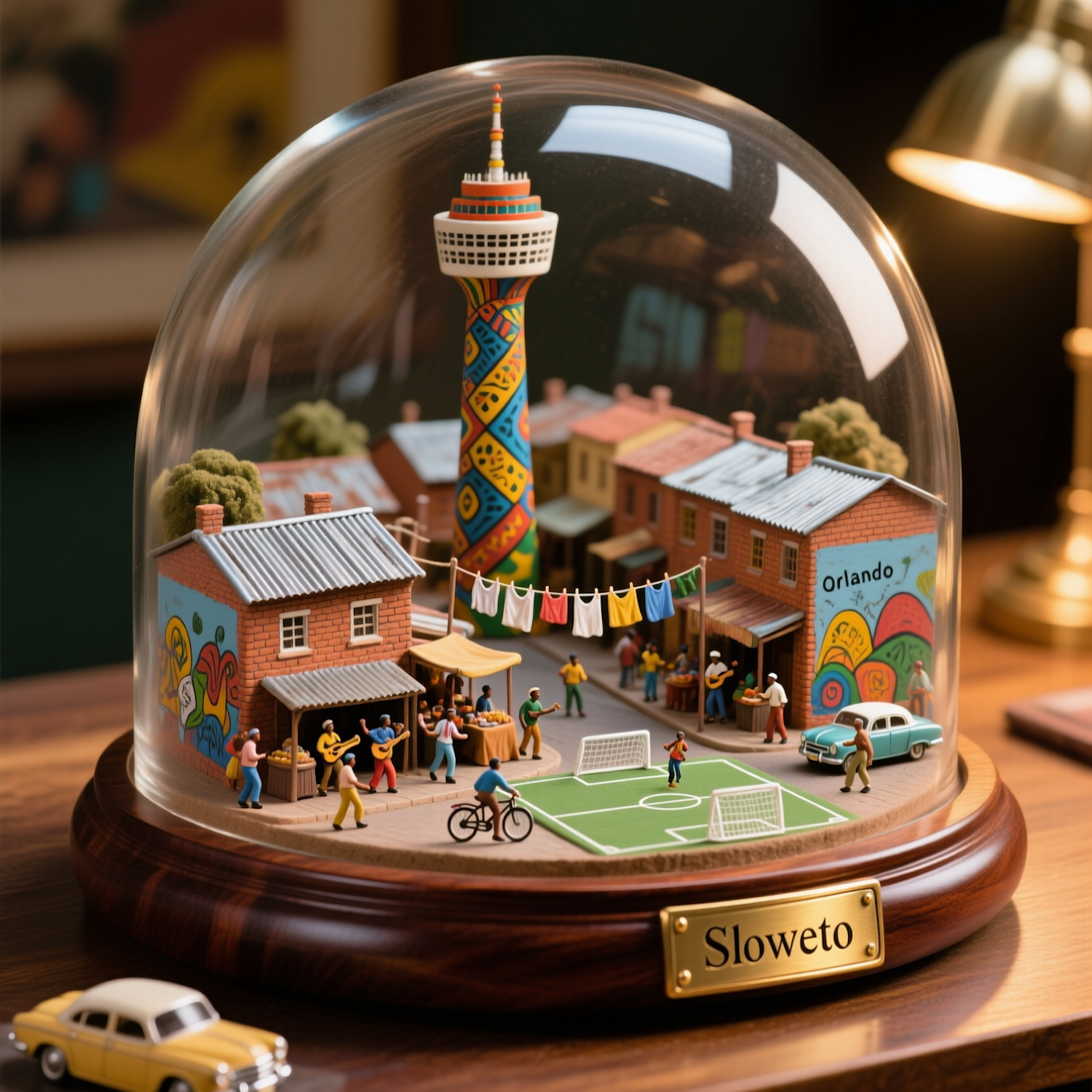 A charming miniature diorama of a vibrant urban neighborhood under a glass dome, featuring a colorful tower and lively street scenes.