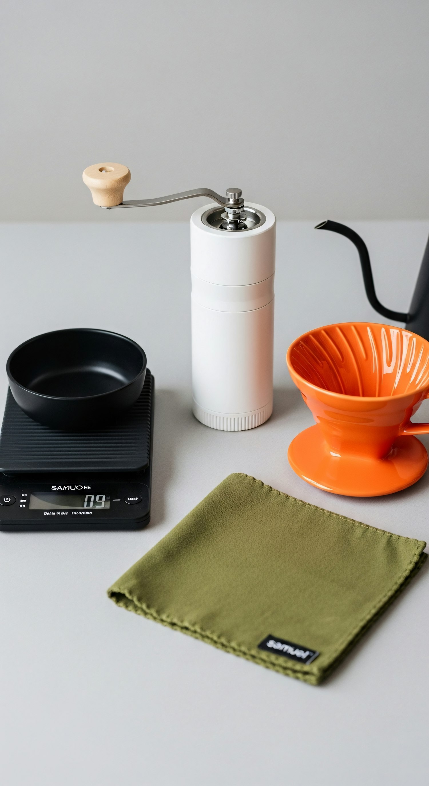 Minimalist coffee brewing setup with a grinder, dripper, scale, and kettle, perfect for pour-over enthusiasts.