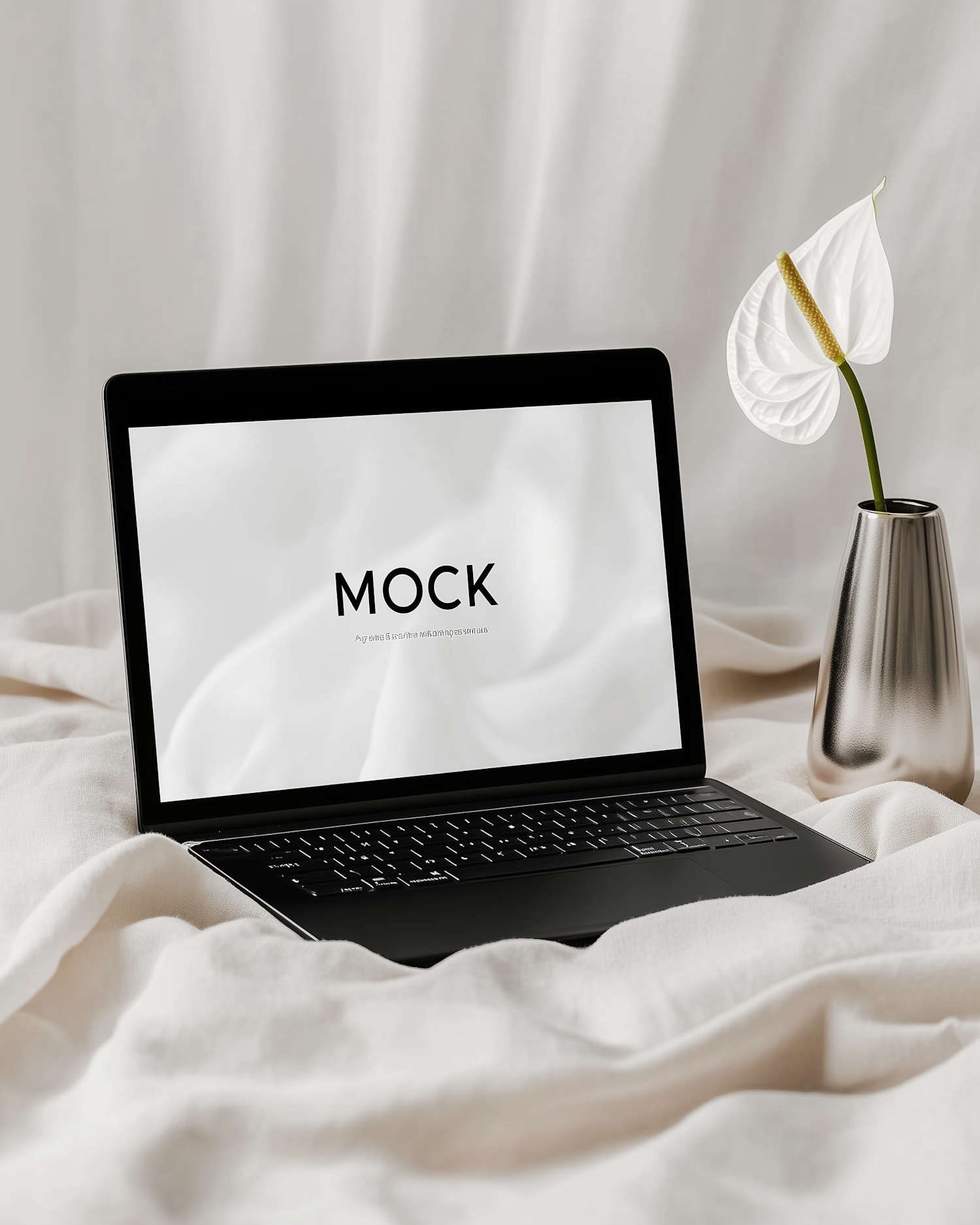 Minimalist laptop mockup on soft fabric with a white anthurium in a metallic vase, perfect for showcasing creative designs.