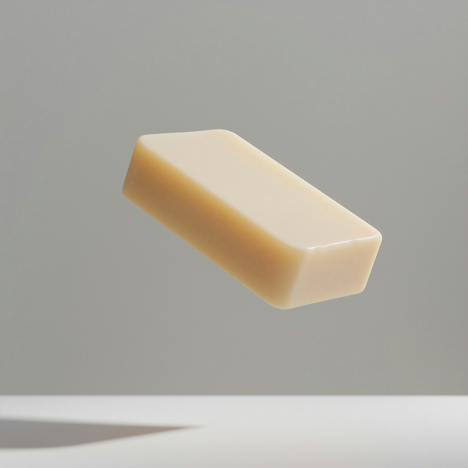 Minimalist shot of a beige soap bar floating mid-air with a clean gray background, perfect for skincare or hygiene product promotions.