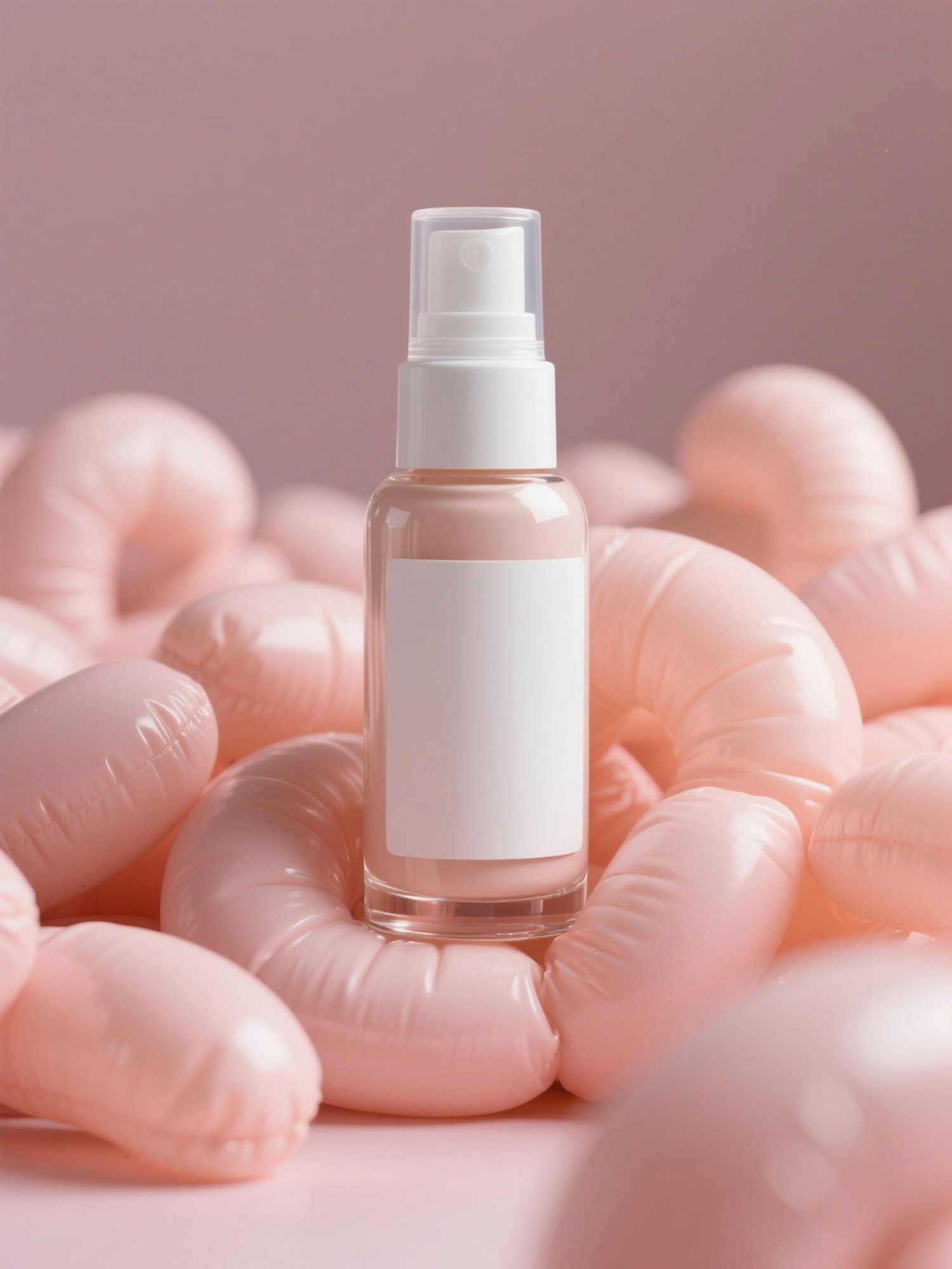 studio shot of a cosmetic product with blank, unbranded packaging, no label, no text, no design, stylized composition, vibrant colors, soft shadows, clean lighting, playful art direction, surreal inflated shapes, harmonious modern aesthetic — a spray bottle with a transparent cap embedded in a sea of shiny peachy foam forms