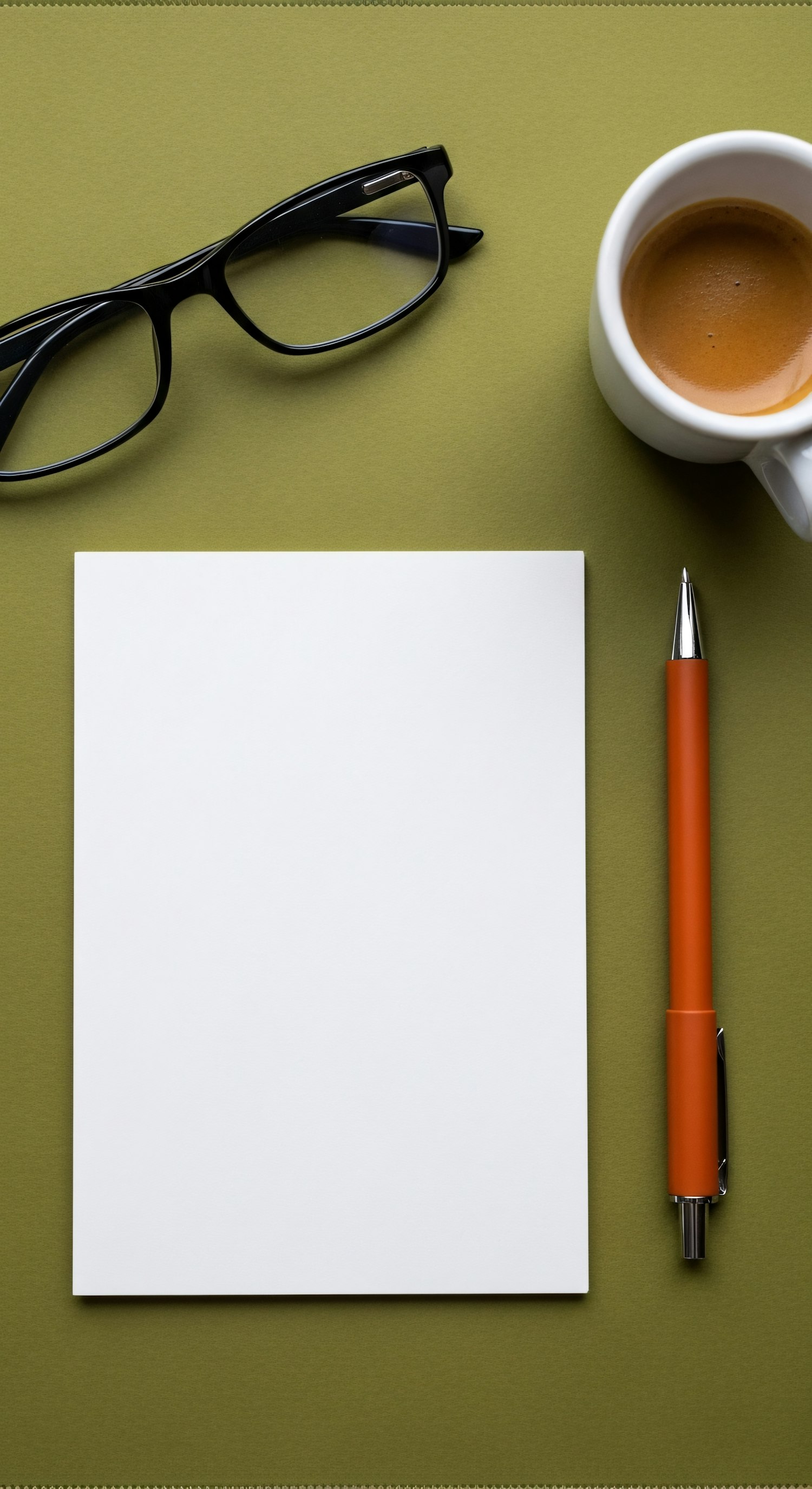 Minimalist workspace setup with a blank notepad, black glasses, orange pen, and a cup of espresso on a green surface.