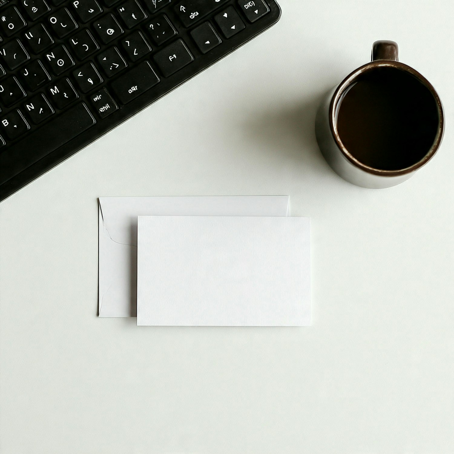 Minimalist workspace with a black keyboard, brown coffee mug, and white envelope on a light surface, perfect for productivity.