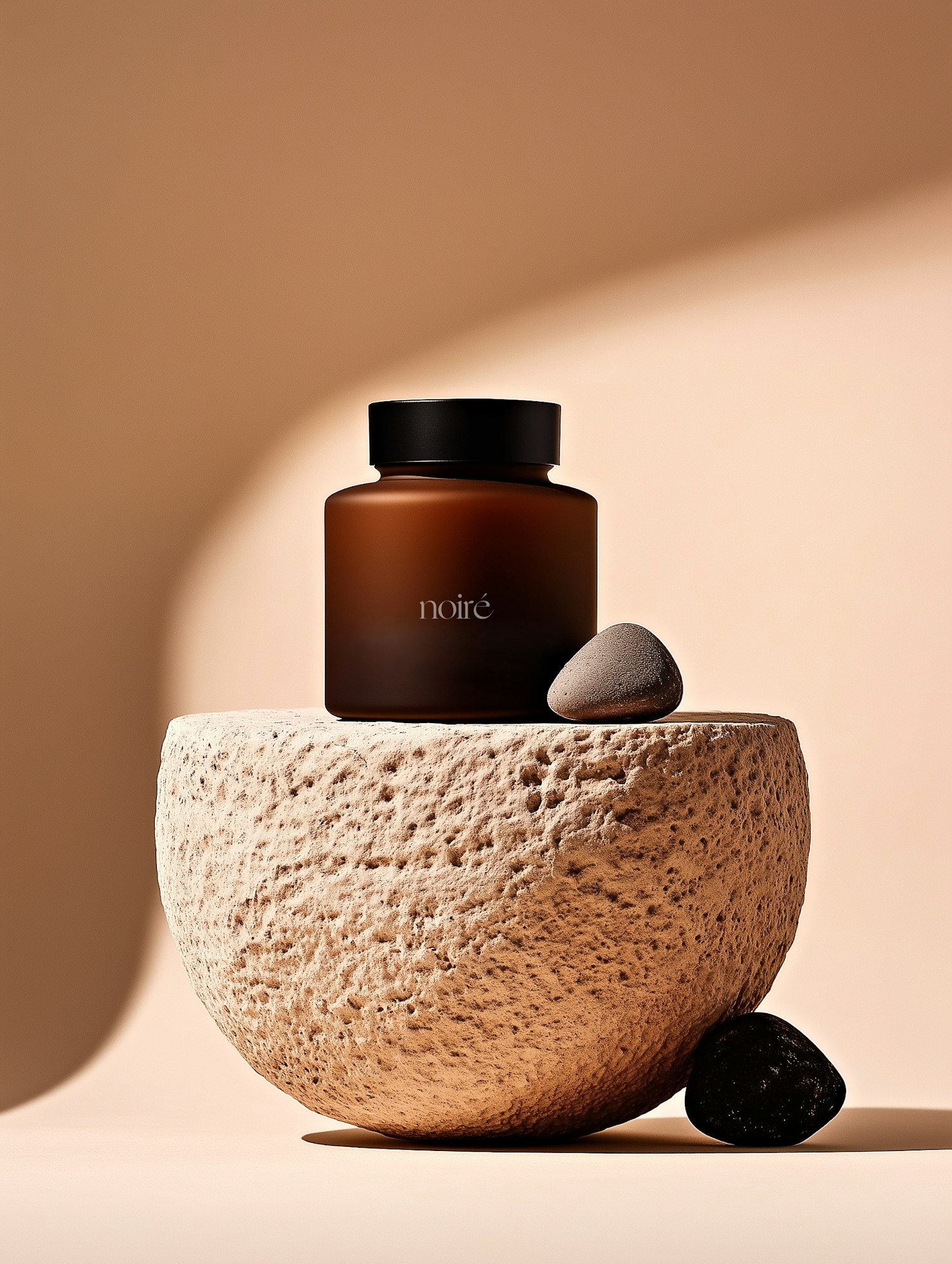 Minimalist amber glass bottle with 'noiré' text, set on a textured stone bowl with smooth stones, against a warm beige background.