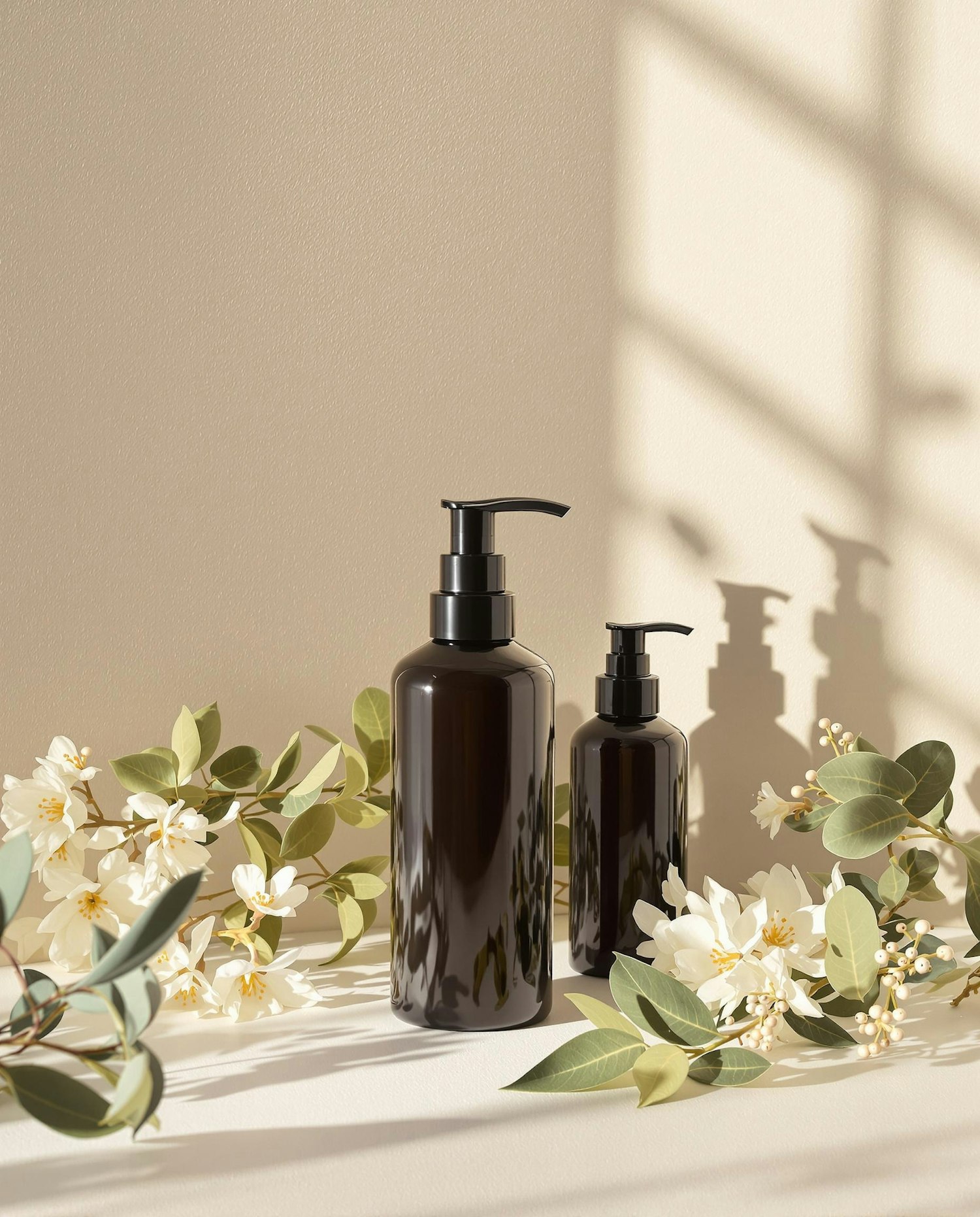 Two dark pump bottles surrounded by white flowers and greenery, set on a cream surface with soft lighting and natural shadows.