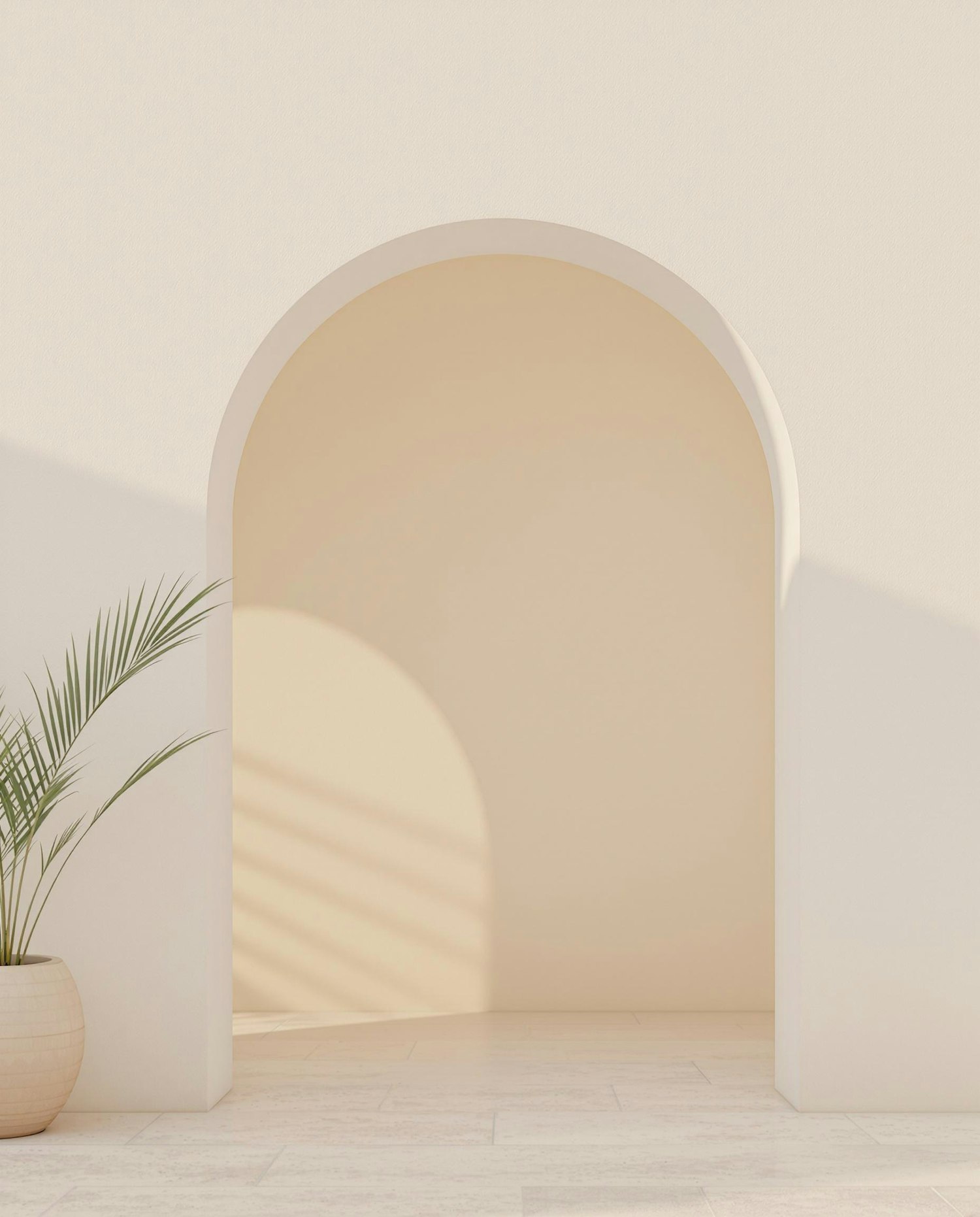 Minimalist interior with a beige arched doorway, light cream walls, and a potted plant adding a natural touch to the serene design.