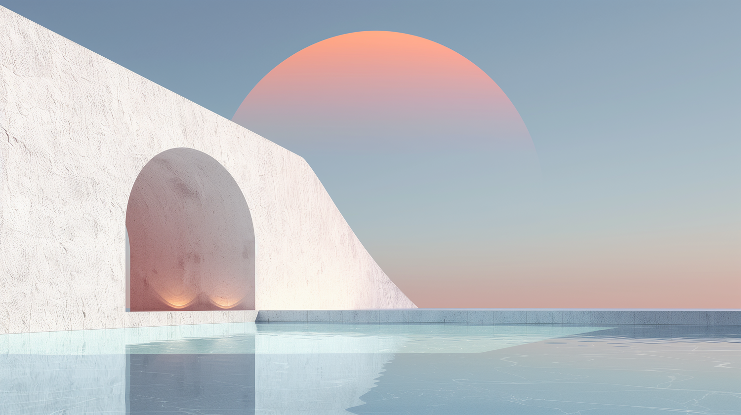 Minimalist scene with a white arched wall, calm water, and a gradient sky with a setting sun. Tranquil and ethereal atmosphere.