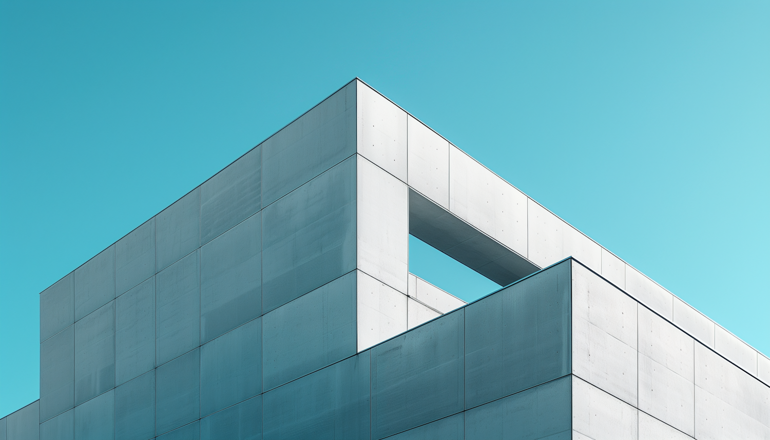 Minimalist concrete building with geometric design against a clear blue sky, featuring a prominent rectangular cutout.