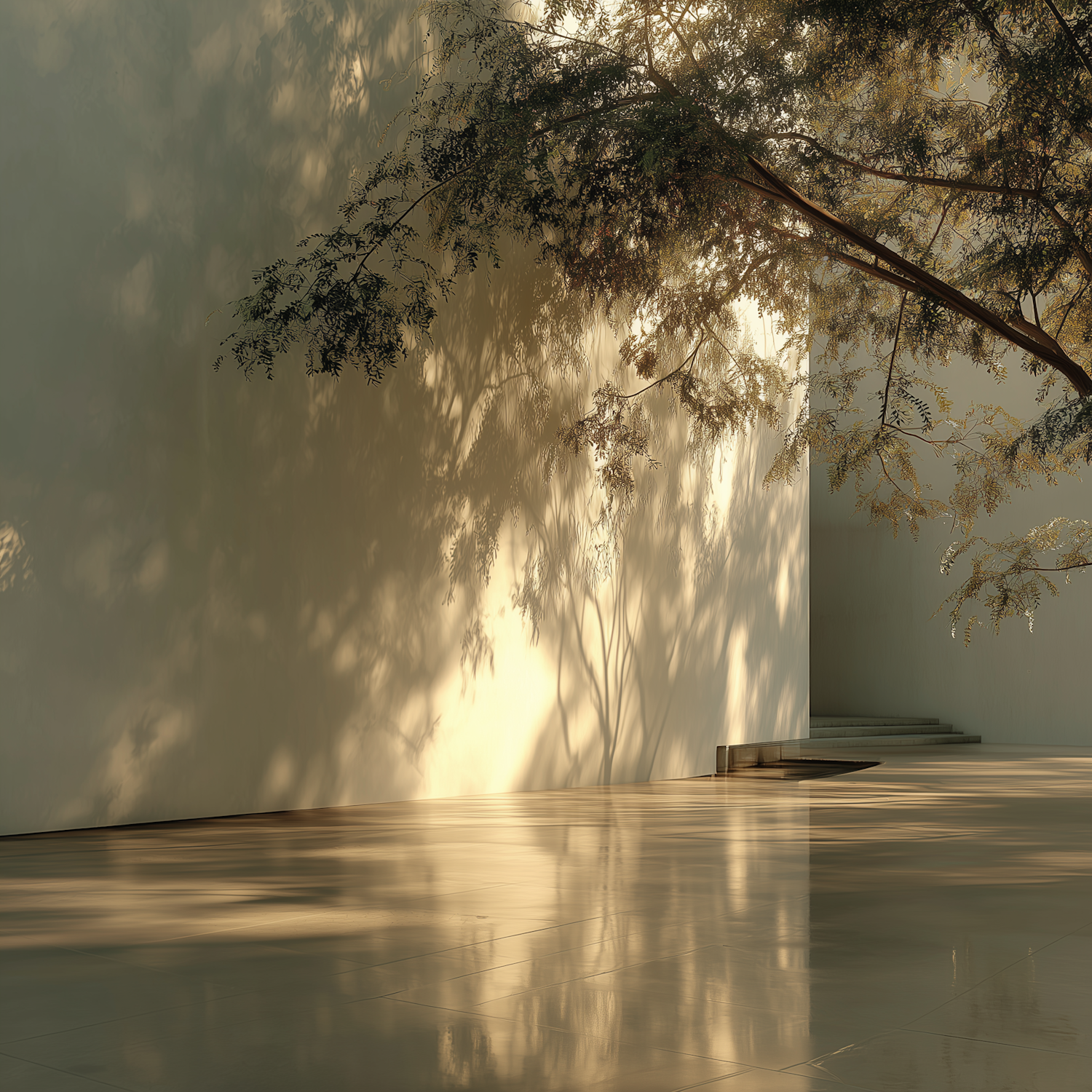 Sunlight filters through tree branches, casting intricate shadows on a minimalist wall and reflective floor, creating a serene ambiance.