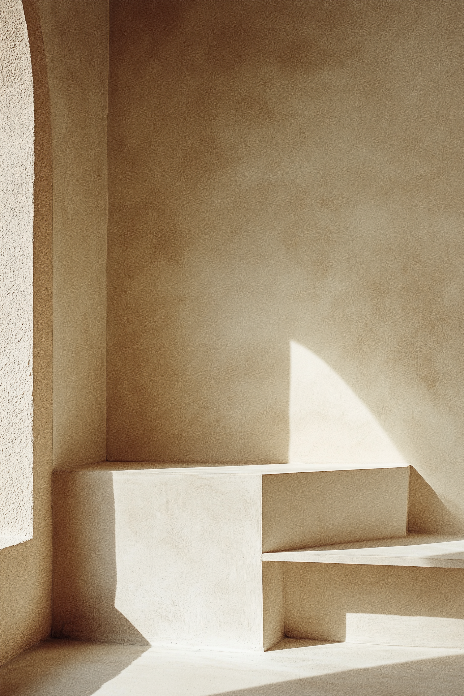 Minimalist architecture with warm light, beige tones, and geometric steps. Elegant shadows and an arched opening create a serene atmosphere.