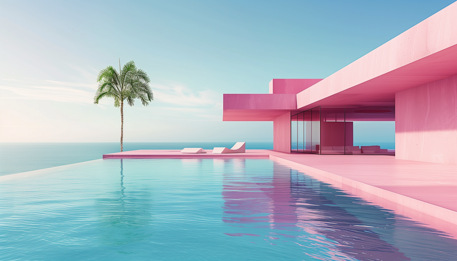 Modern pink house with infinity pool, tropical palm tree, and sleek design overlooking a serene ocean horizon.