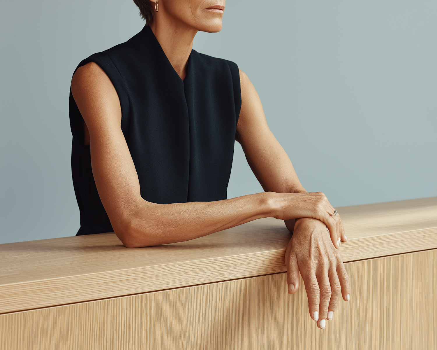Minimalist composition of a person in a black sleeveless top leaning on a wooden surface, with a soft blue background.