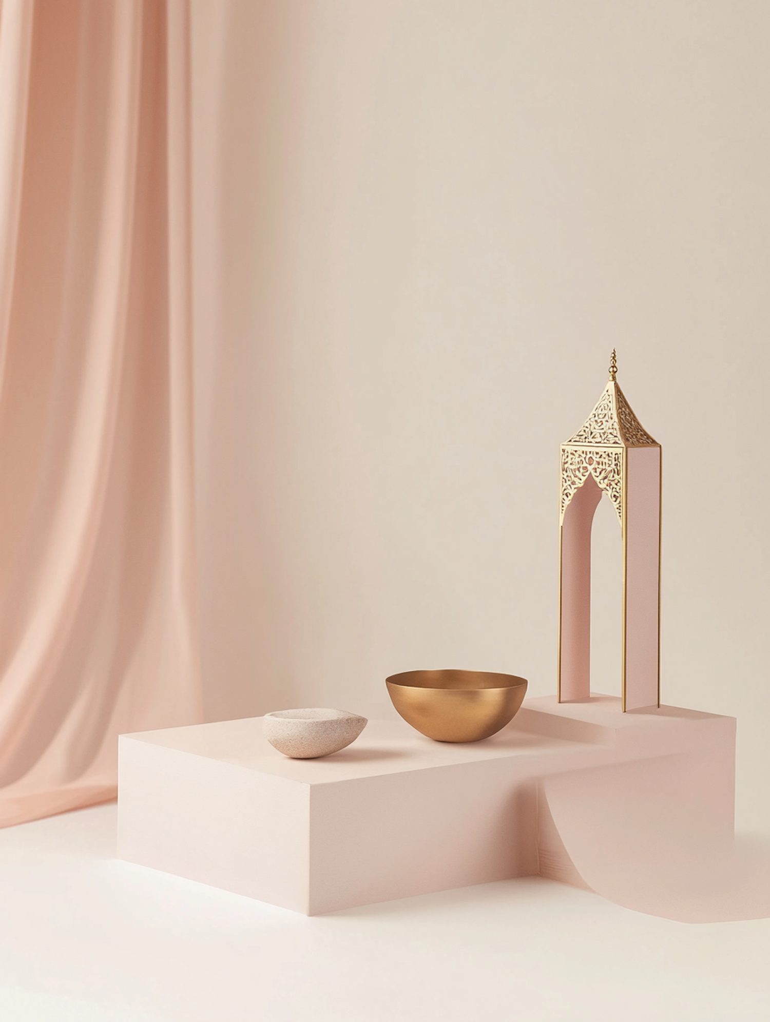 Minimalist scene with a pink platform, stone and golden bowls, and an ornate lantern. Soft pink fabric background adds elegance.
