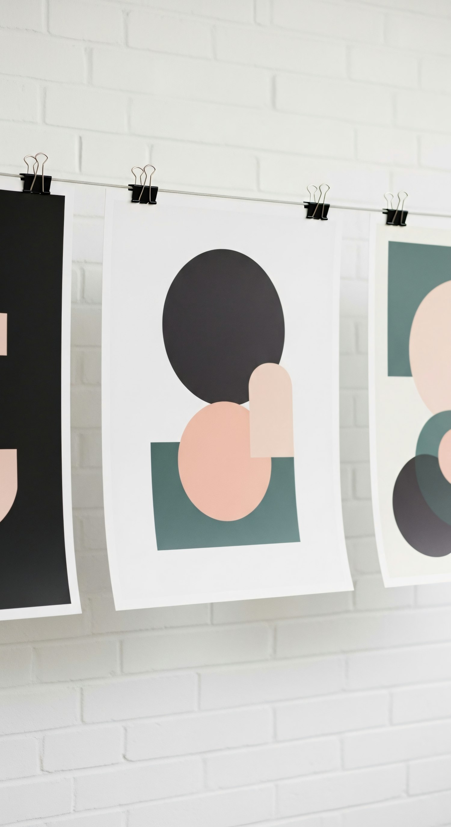 Minimalist geometric art prints in muted tones hang on a line against a white brick wall, creating a clean and modern aesthetic.