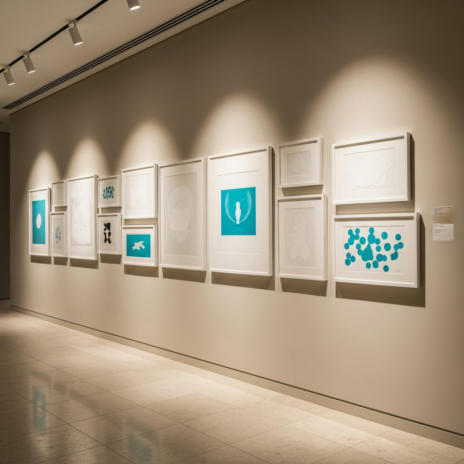 Minimalist art gallery wall with turquoise and white framed artworks, arranged neatly under soft lighting in a modern exhibition space.