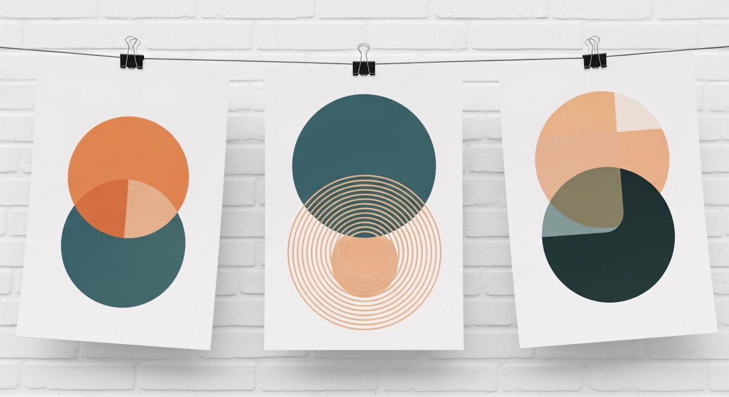 Minimalist geometric art prints with overlapping circles in orange and teal tones, clipped to a string against a white brick wall.