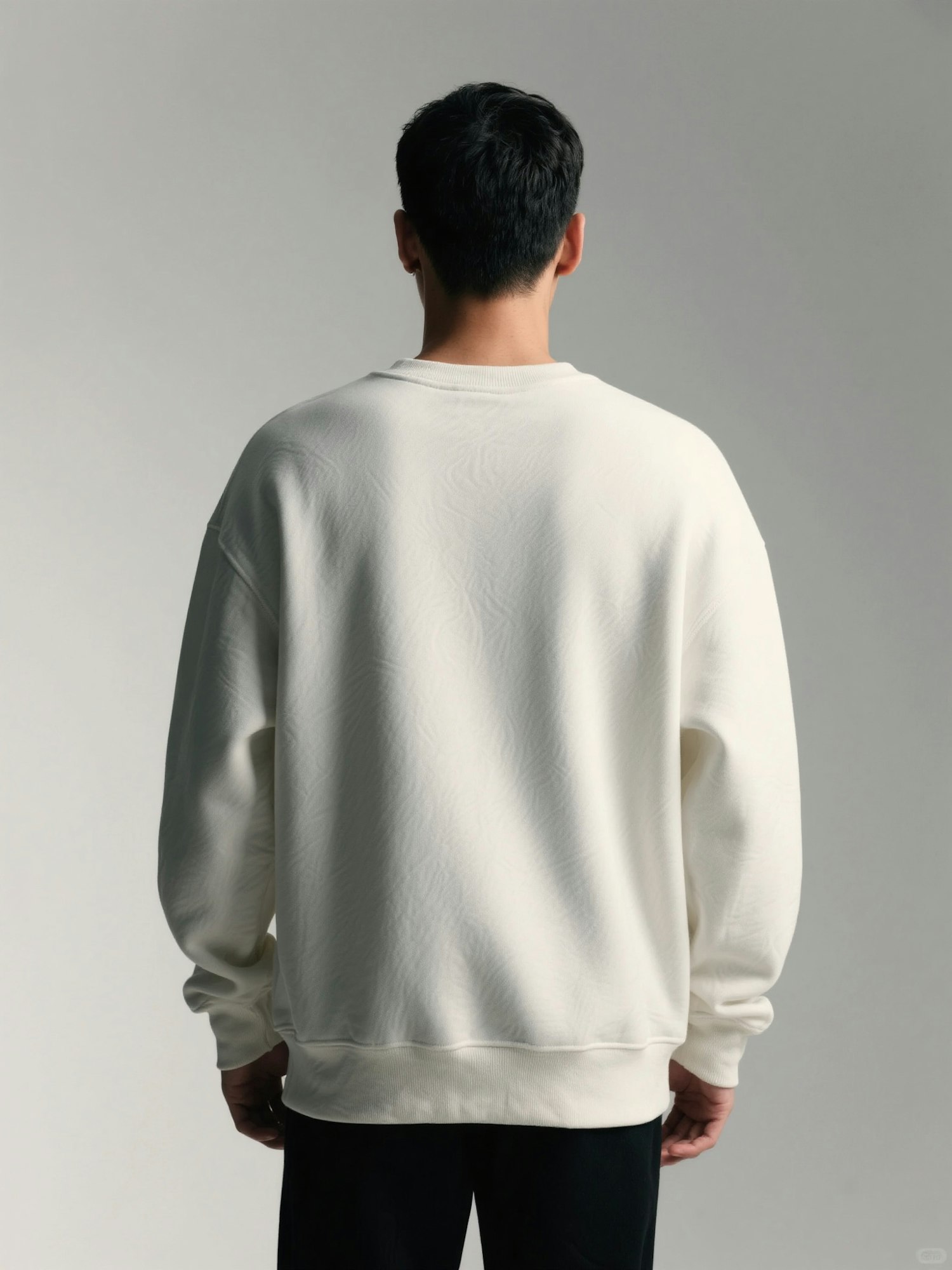 A person in a white sweatshirt and dark pants stands against a neutral background, showcasing a minimalist and casual style.