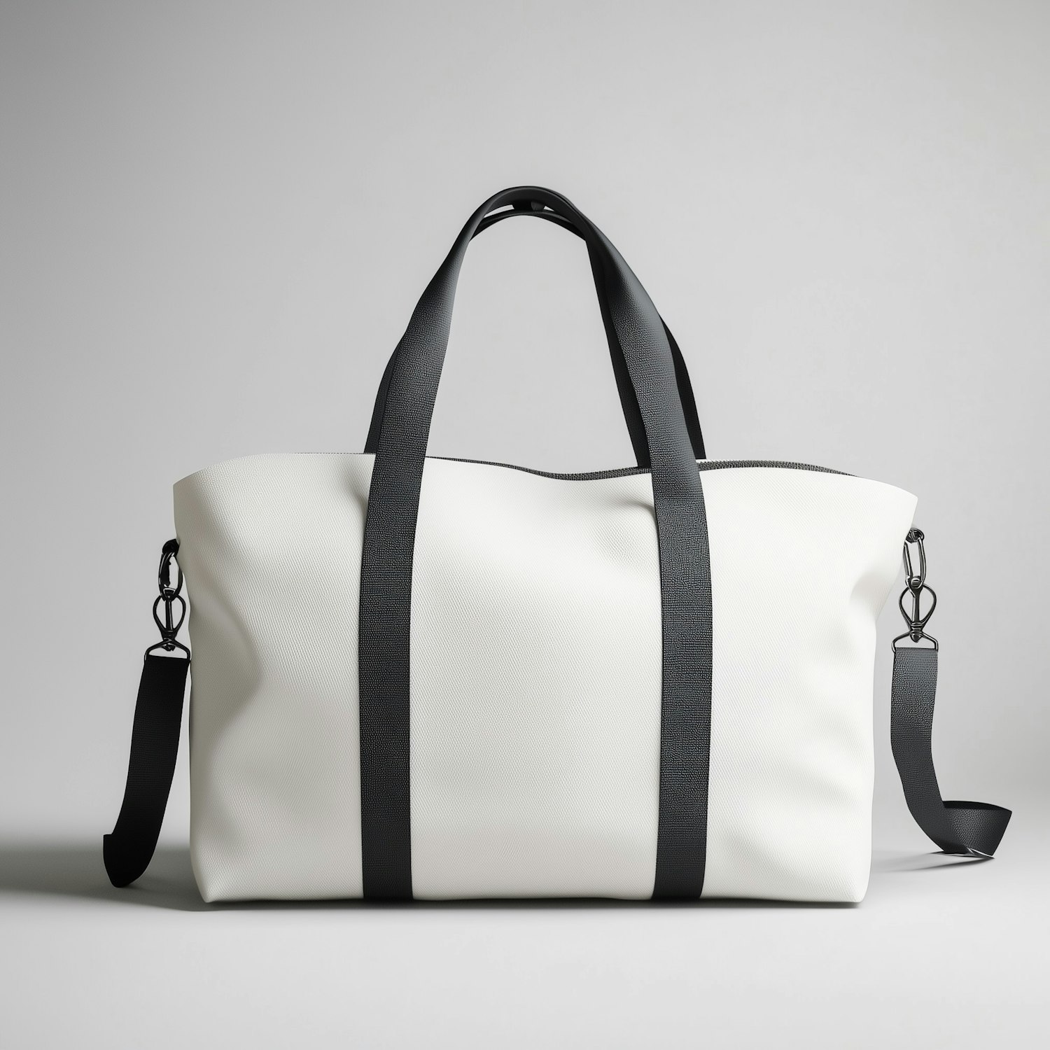 Stylish white duffel bag with black straps and detachable shoulder strap, perfect for travel or gym use.