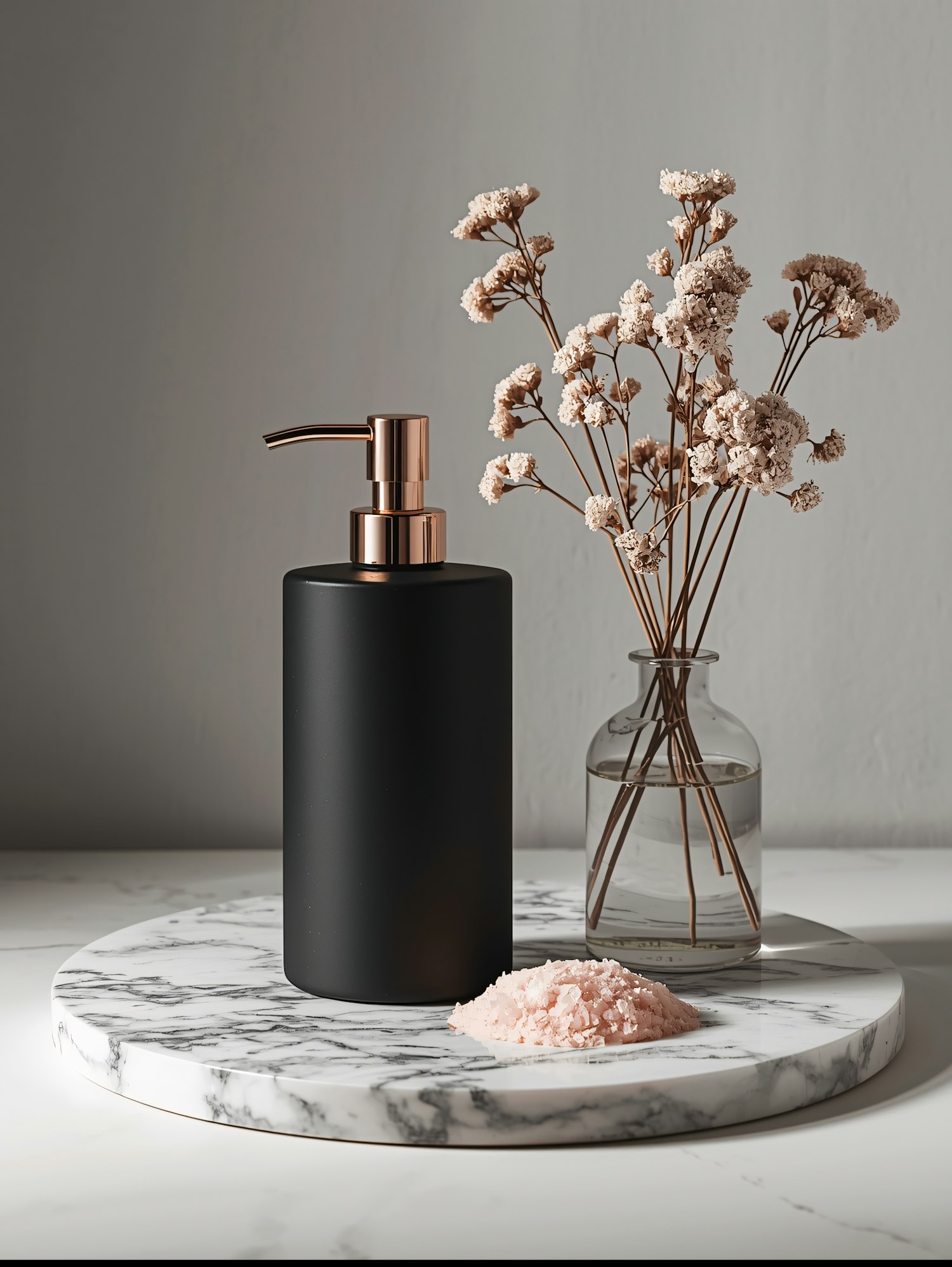Elegant black soap dispenser with rose gold accents, dried flowers in a glass vase, and pink bath salts on a marble tray.