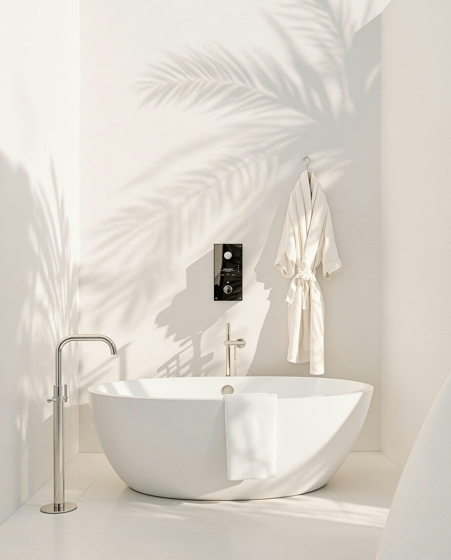 Minimalist bathroom with a freestanding tub, sleek faucet, and palm leaf shadows on white walls for a serene, modern vibe.