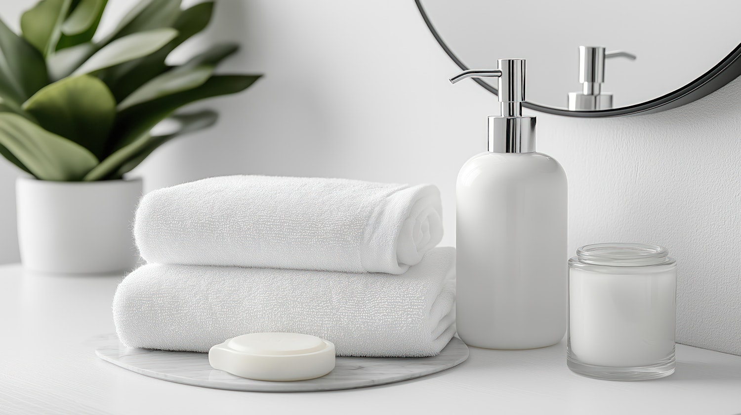 Elegant bathroom setup with white towels, soap, lotion dispenser, and a green plant for a fresh, clean look.