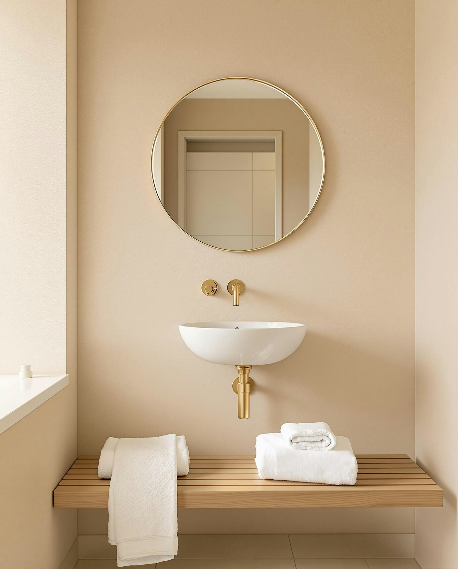 Minimalist bathroom with a round mirror, gold fixtures, a white sink, and a wooden bench with folded towels in a beige-toned space.