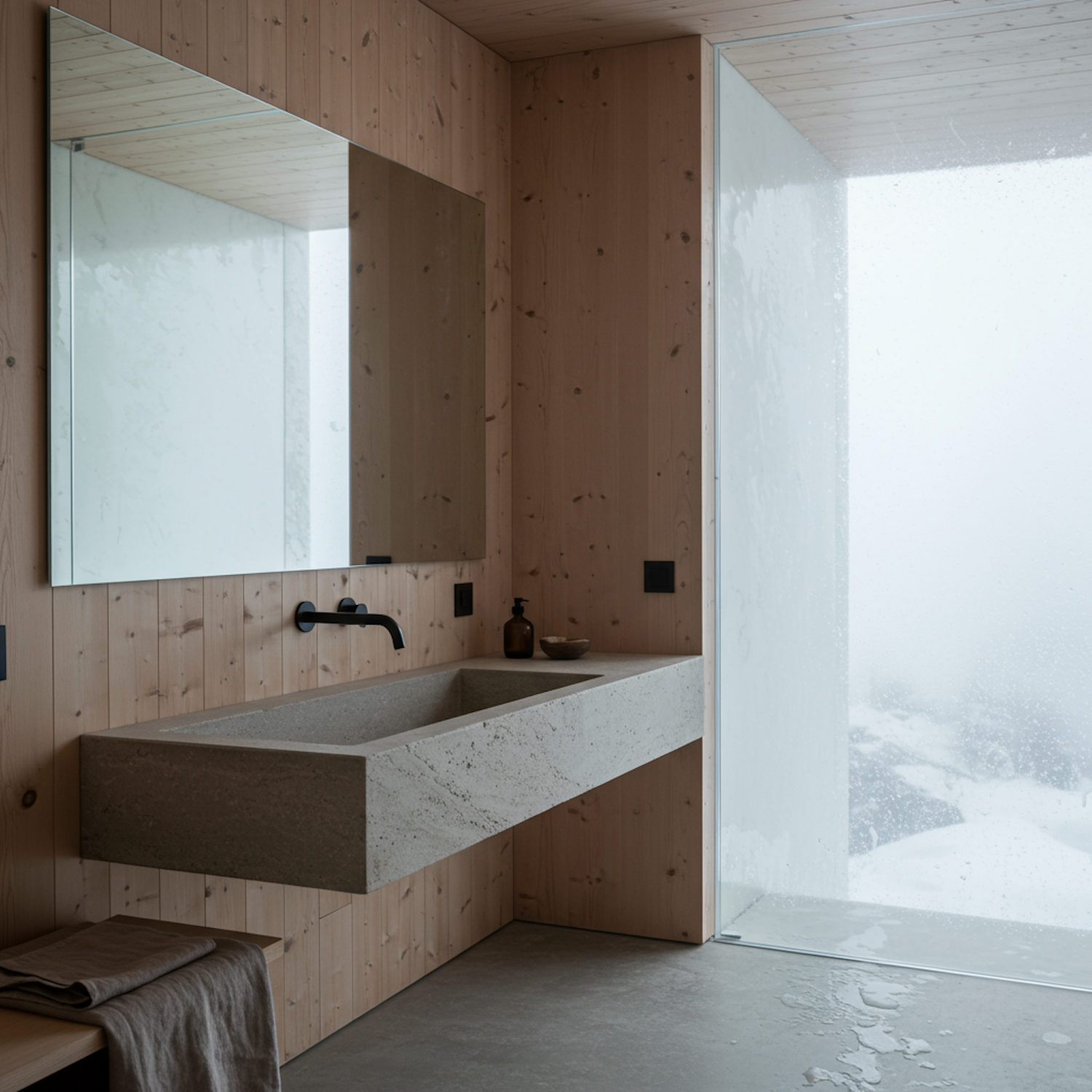 Minimalist bathroom with wood paneling, a concrete sink, and a floor-to-ceiling window overlooking a snowy, foggy landscape.