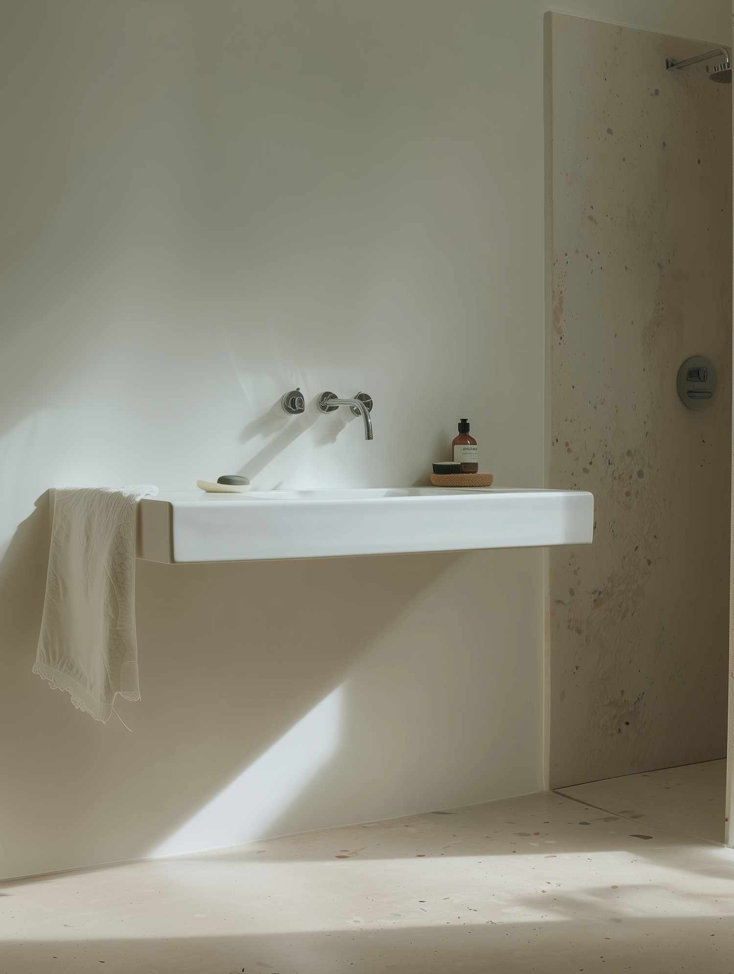 Minimalist bathroom with a white wall-mounted sink, chrome faucet, and soft lighting, creating a serene and clean atmosphere.