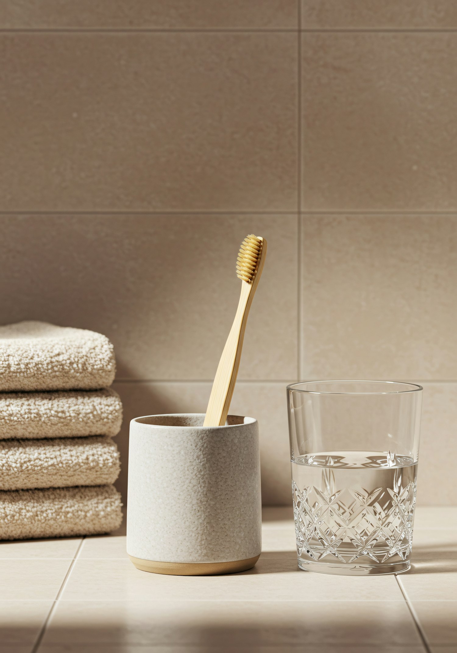 A bamboo toothbrush in a ceramic holder, a crystal glass of water, and folded beige towels on a tiled bathroom counter.