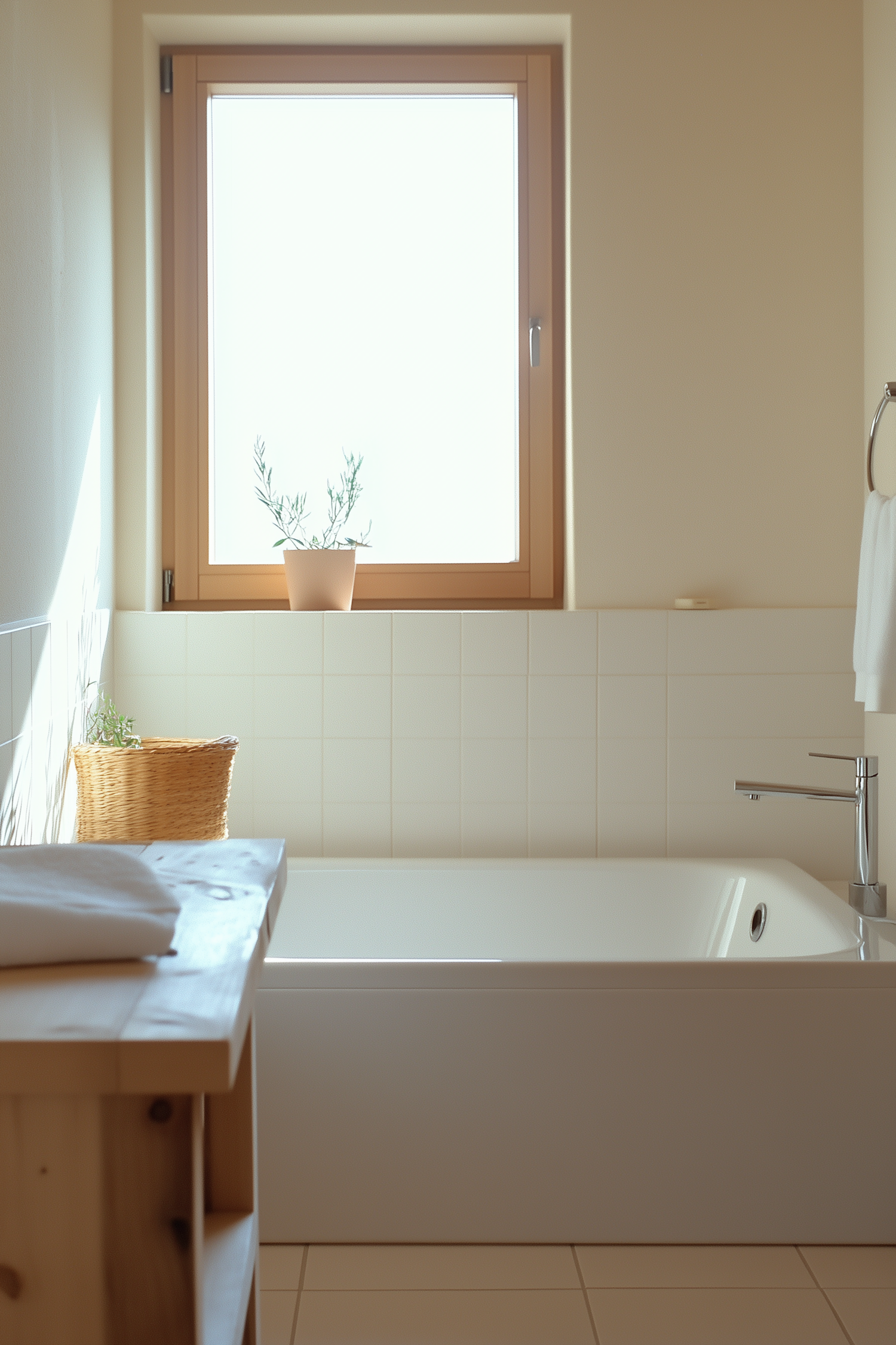 Minimalist bathroom with a white tub, wooden accents, natural light, and greenery for a serene and inviting atmosphere.