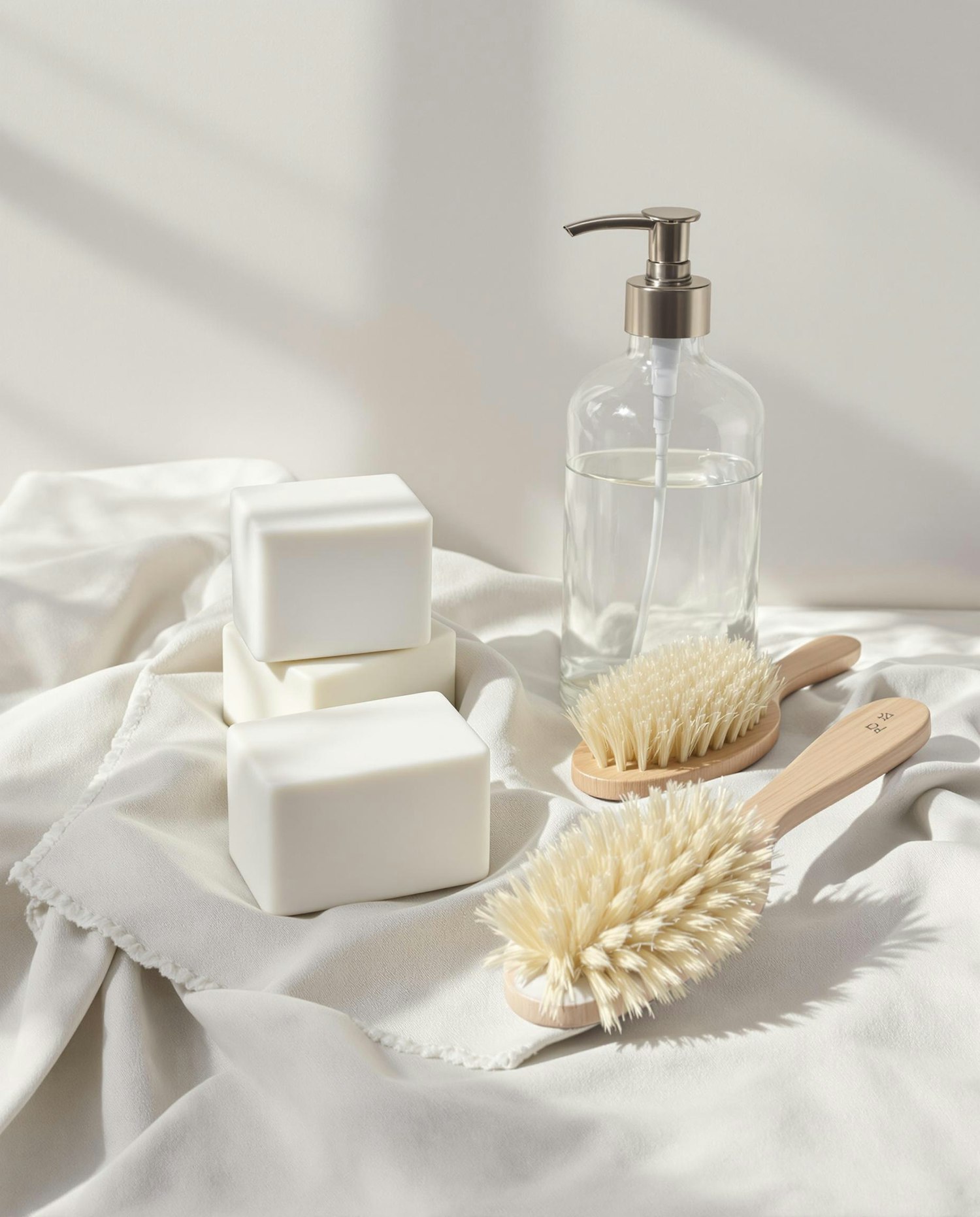 A soft, minimalist still life captured in cool diffused daylight, featuring matte surfaces, creamy textures and pale neutral tones on light grey or stone backgrounds. All labels are blank. Still life of white solid soap bars, a wooden brush and a glass bottle on a neutral fabric with soft shadows.