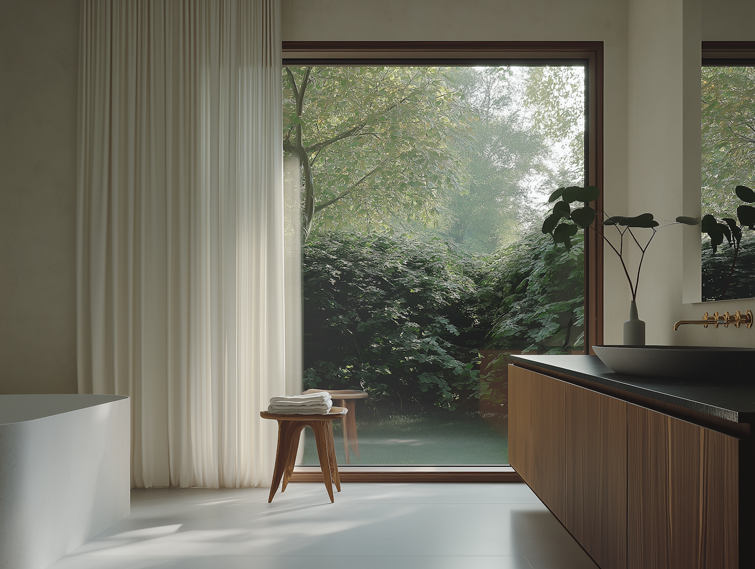 Minimalist bathroom with a large window, lush garden view, wooden vanity, freestanding tub, and soft white curtains for a serene vibe.
