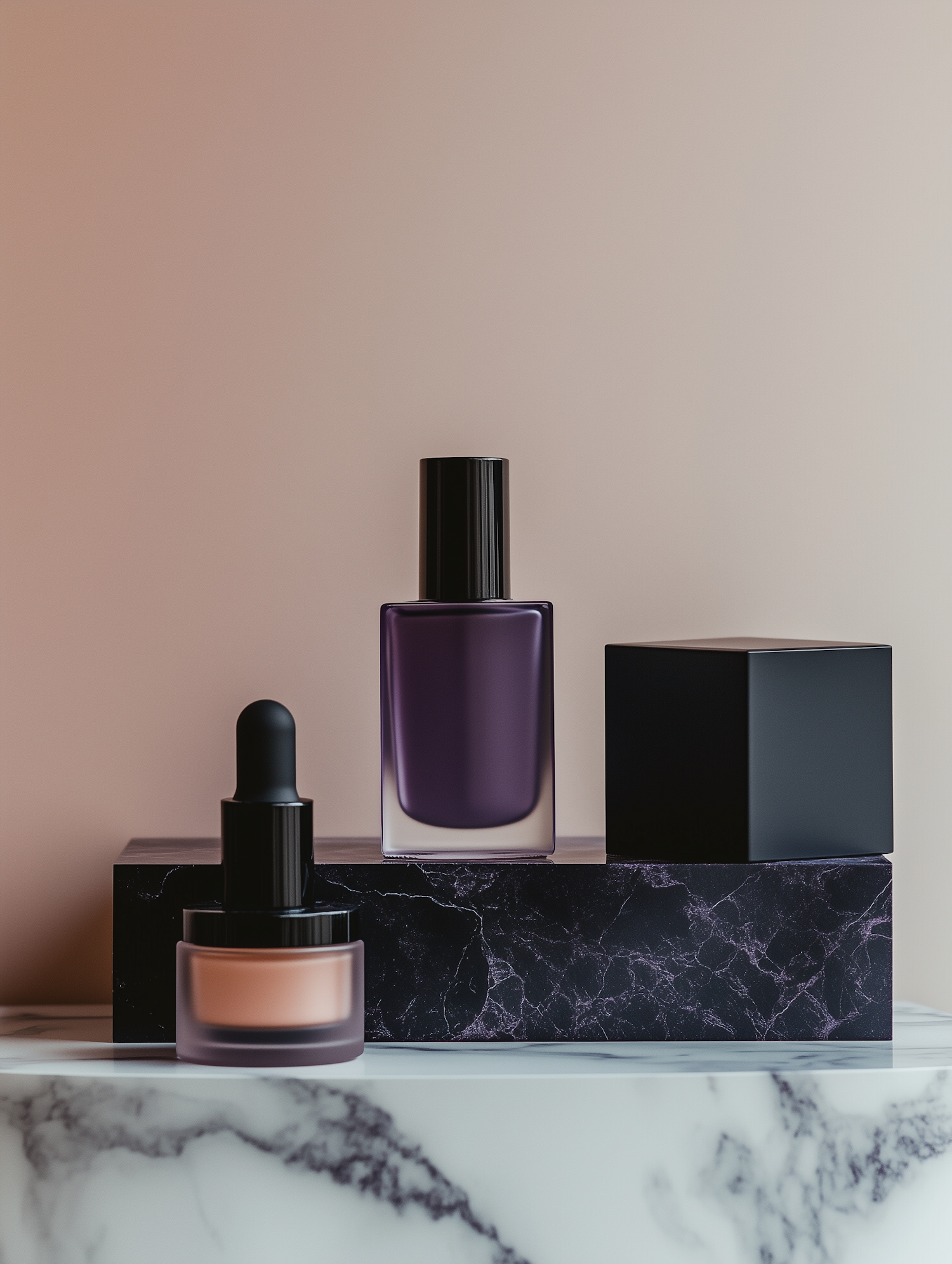 Minimalist beauty product display with frosted glass, purple bottle, and black cube on a marble platform. Soft beige background.
